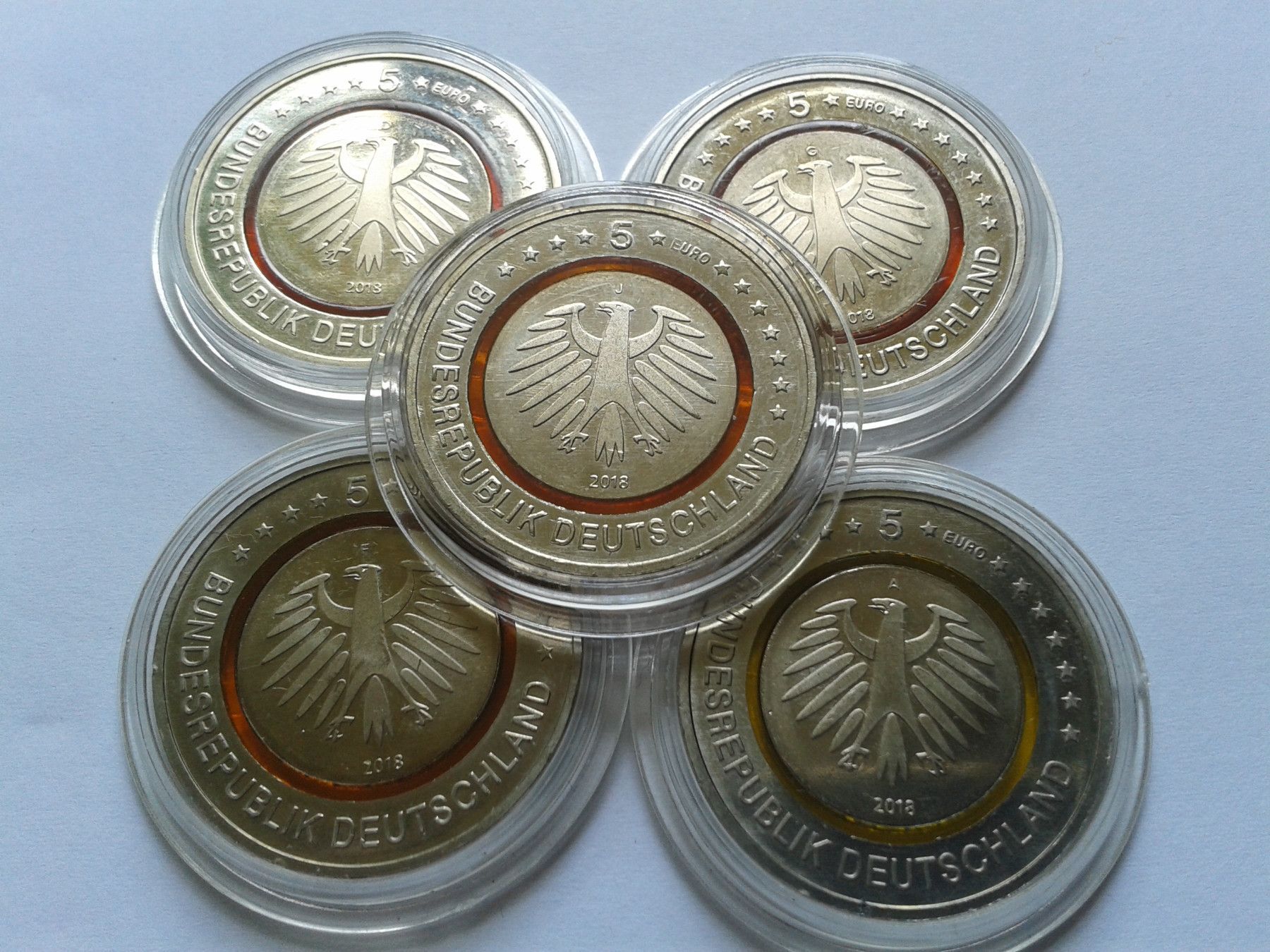 Original 5 x 5 euro 2018 ADFGJ im Set, Polymerrring. Sie kaufen das Komplettset der Prägestätten A (Berlin), D (München), F (Stuttgart), G (Karlsruhe) und J (Hamburg), also auf 5 Münzen in der bankfrischen Prägequalität. bei Fragen: