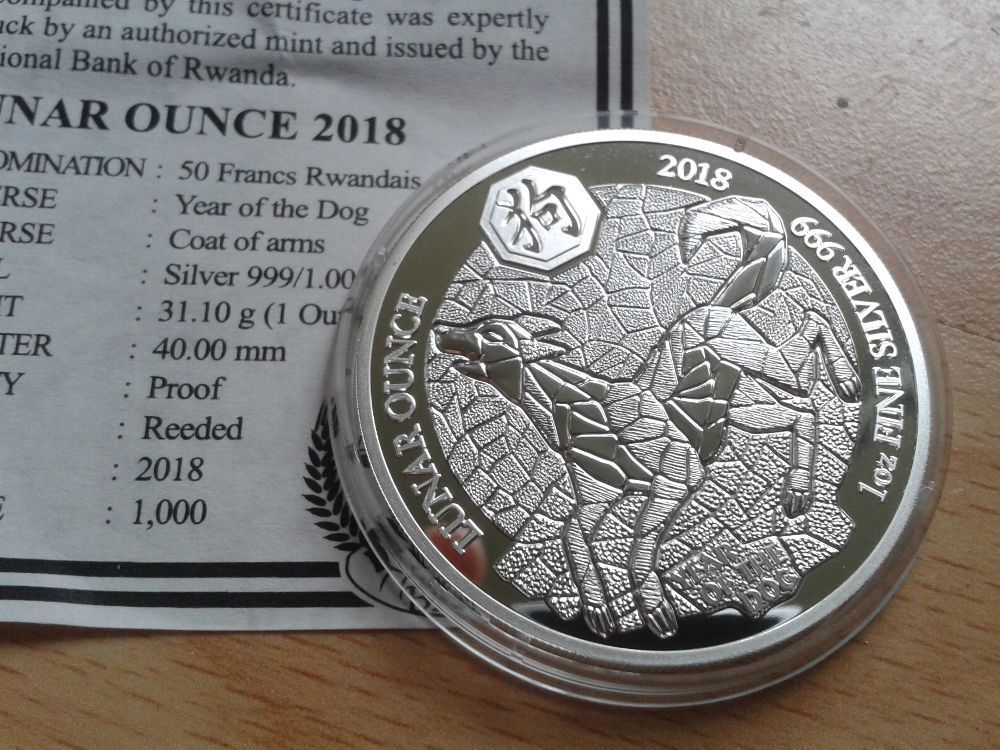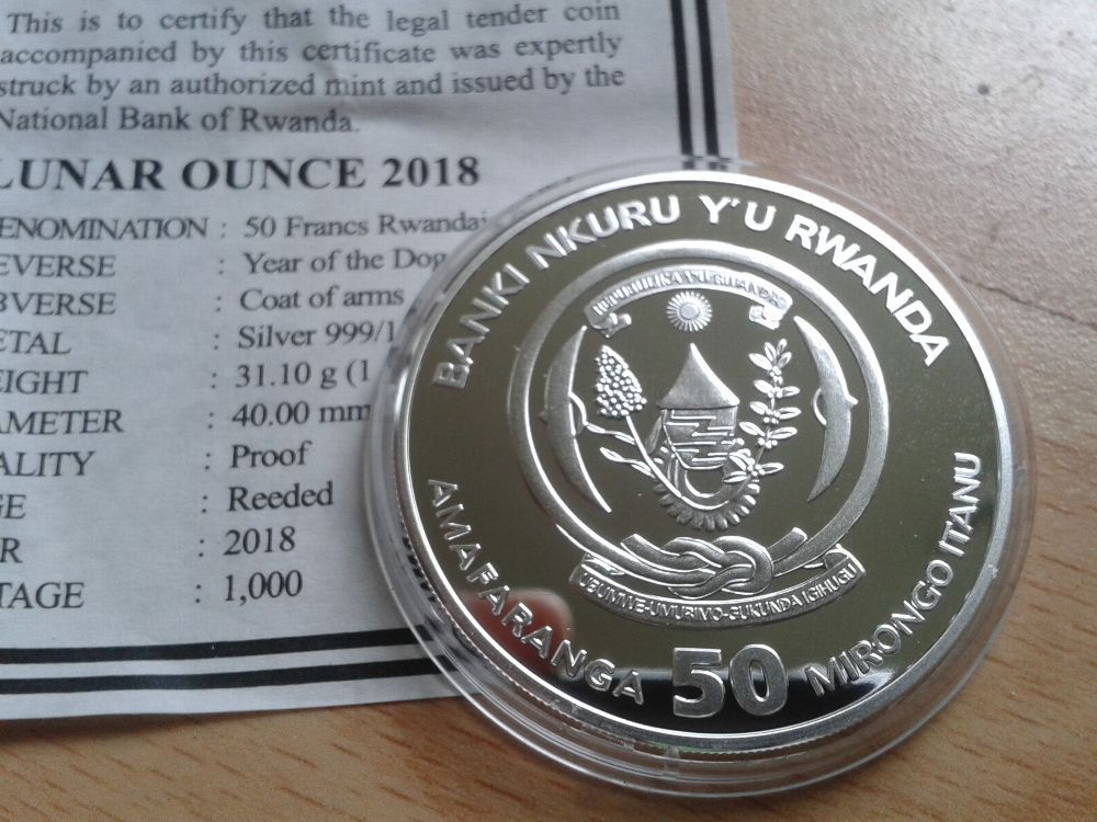 Original 50 Francs 2018 PP Ruanda Rwanda Lunar Hund 1 Unze Silber