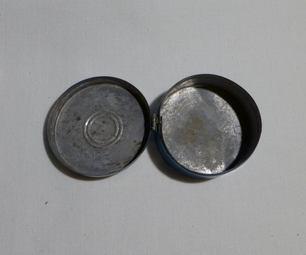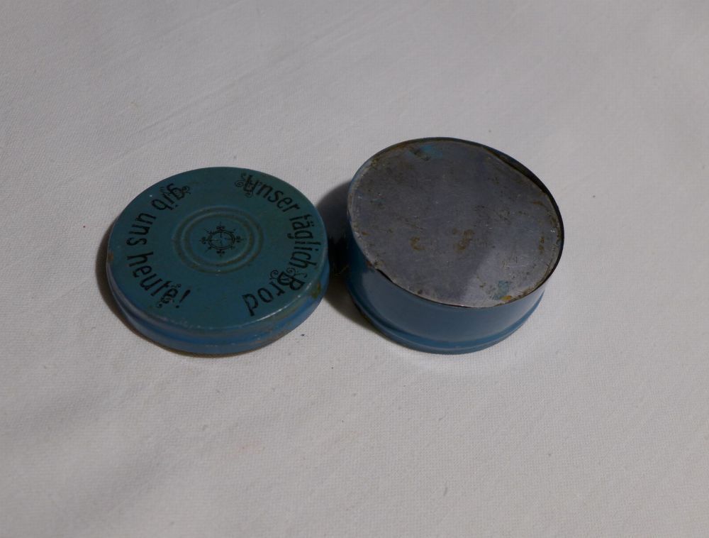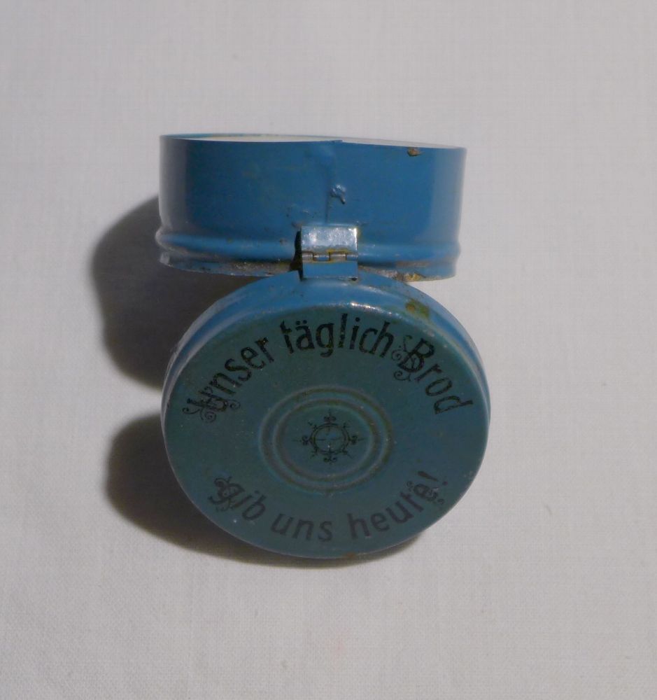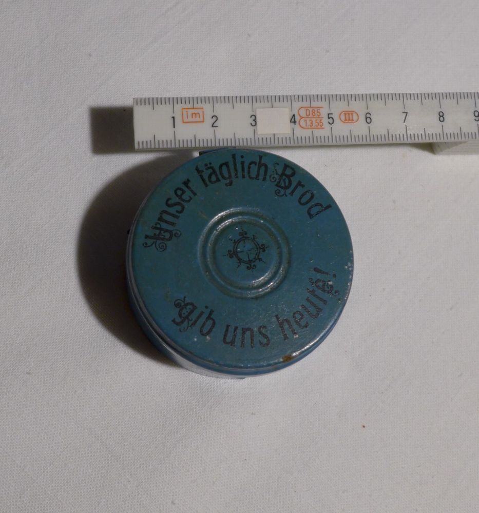 original alt Blech Brotkapsel blau rund Unser täglich Brod gib uns heute Puppenküche
