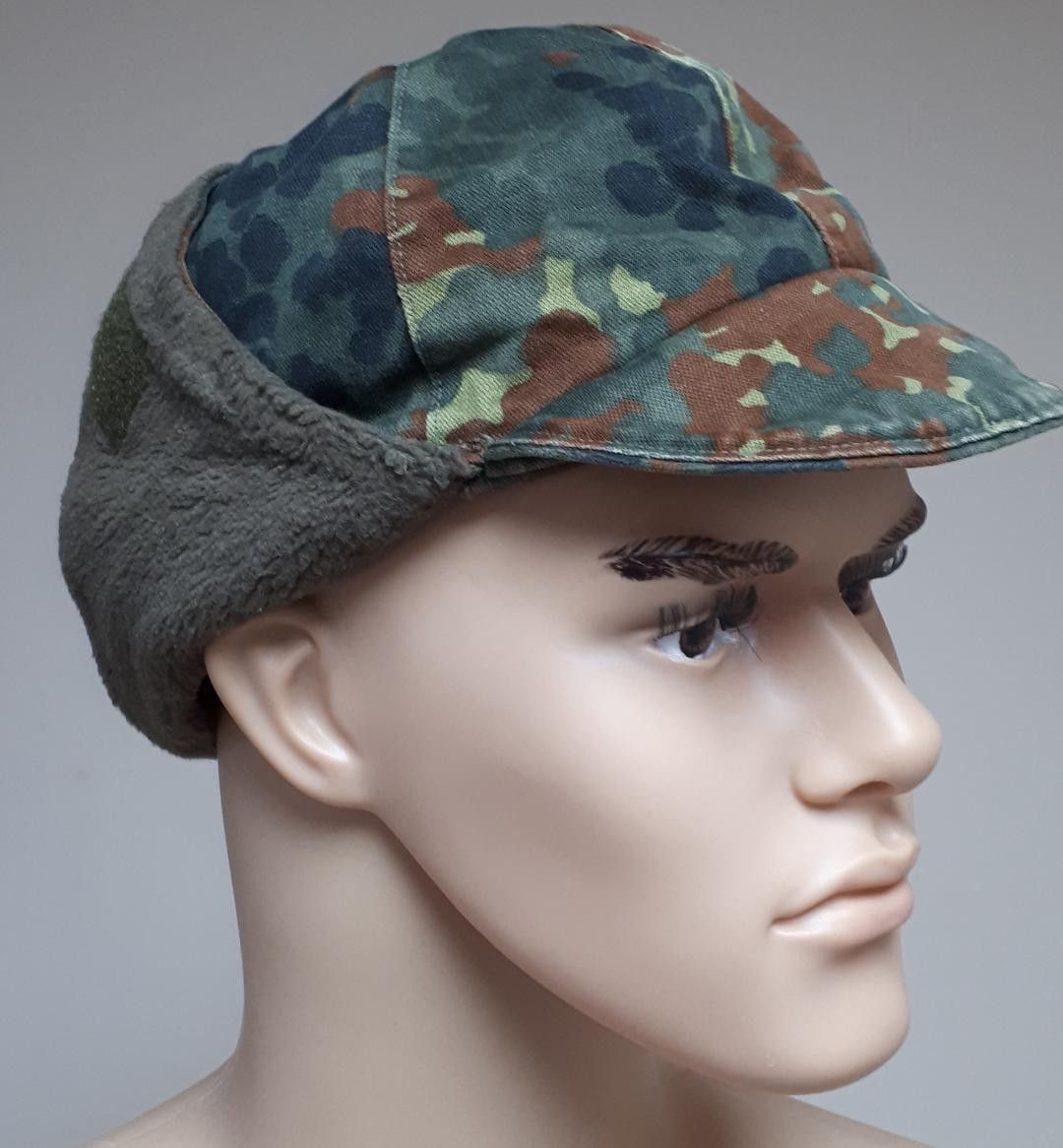 Original Bundeswehr Wintermütze K 5 Die Wintermütze der Bundeswehr mit Webpelzfutter und abklappbaren Ohrenschützern. Der Ohrenschutz kann oben zusammengeklettet werden. Herunter geklappt hält er die Nacken- und Halspartie warm. * verschiedene Größen * Farbe: flecktarn * Gewicht. 142 g Zustand: gut - gebraucht mit kleineren Gebrauchsspuren (Plüschfutter weicht farblich ab, ferner können kleinere Löcher im Innenleben vorkommen) Abbildung ist beispielhaft, Abweichungen kommen vor!