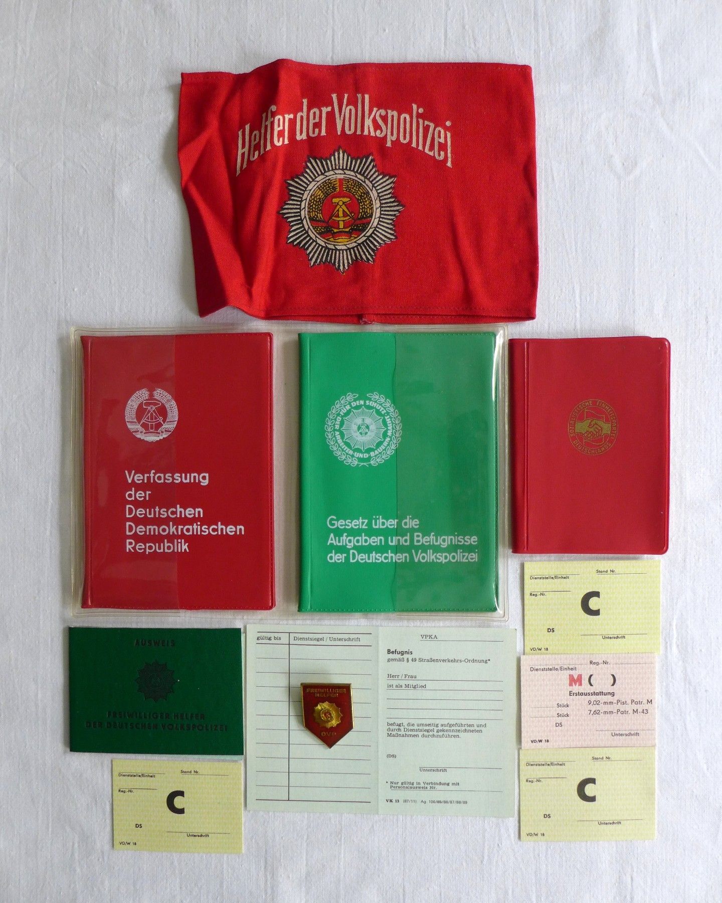 original DDR Ausweise Helfer der Volkspolizei + Abzeichen + 4 Karten + Gesetze MdI