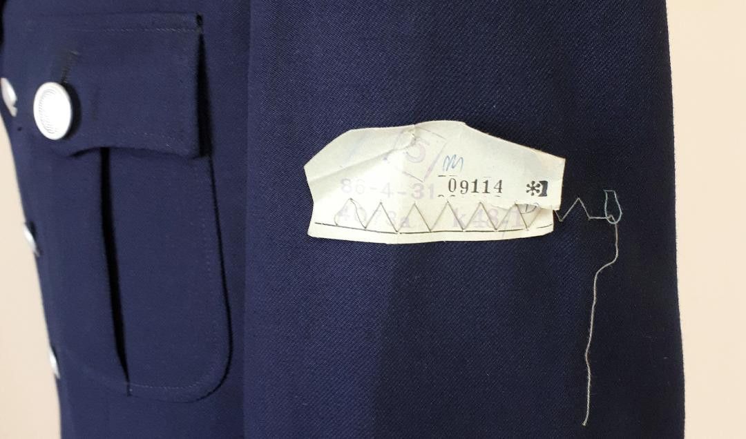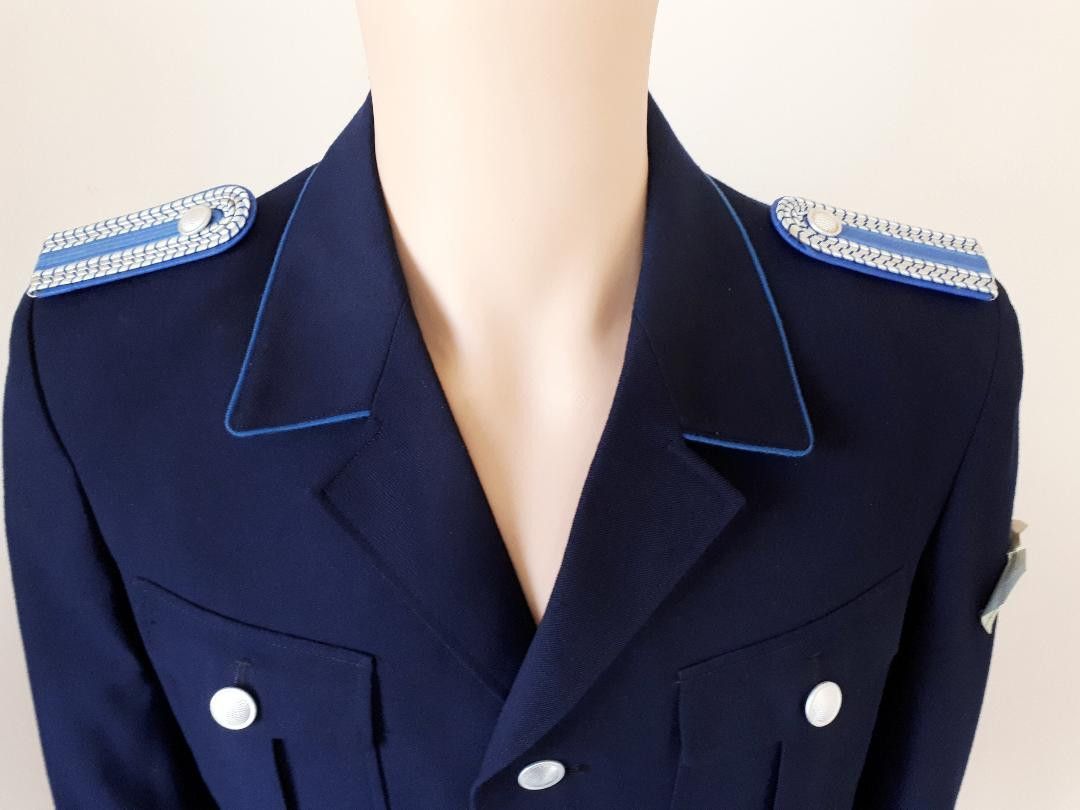 Original DDR MdI TraPo Transportpolizei Uniformjacke Oberwachtmeister K 54 * 4 er Knopfleiste * Stempelung MdI 1850 P/1 (1.Quartal 1986) * Hersteller: Werk Halle, VEB Burger Bekleidung Zustand: Kammerware, neu - ungetragen * Empfehlung dazu: Je nach persönlichem Anspruch besteht die Möglichkeit, die Uniformjacke in einer Fachreinigung chemisch reinigen zu lassen. Farbe: dunkelblau, Farbe kann auf den Fotos je nach Lichteinfall variieren Größe: k 48-1