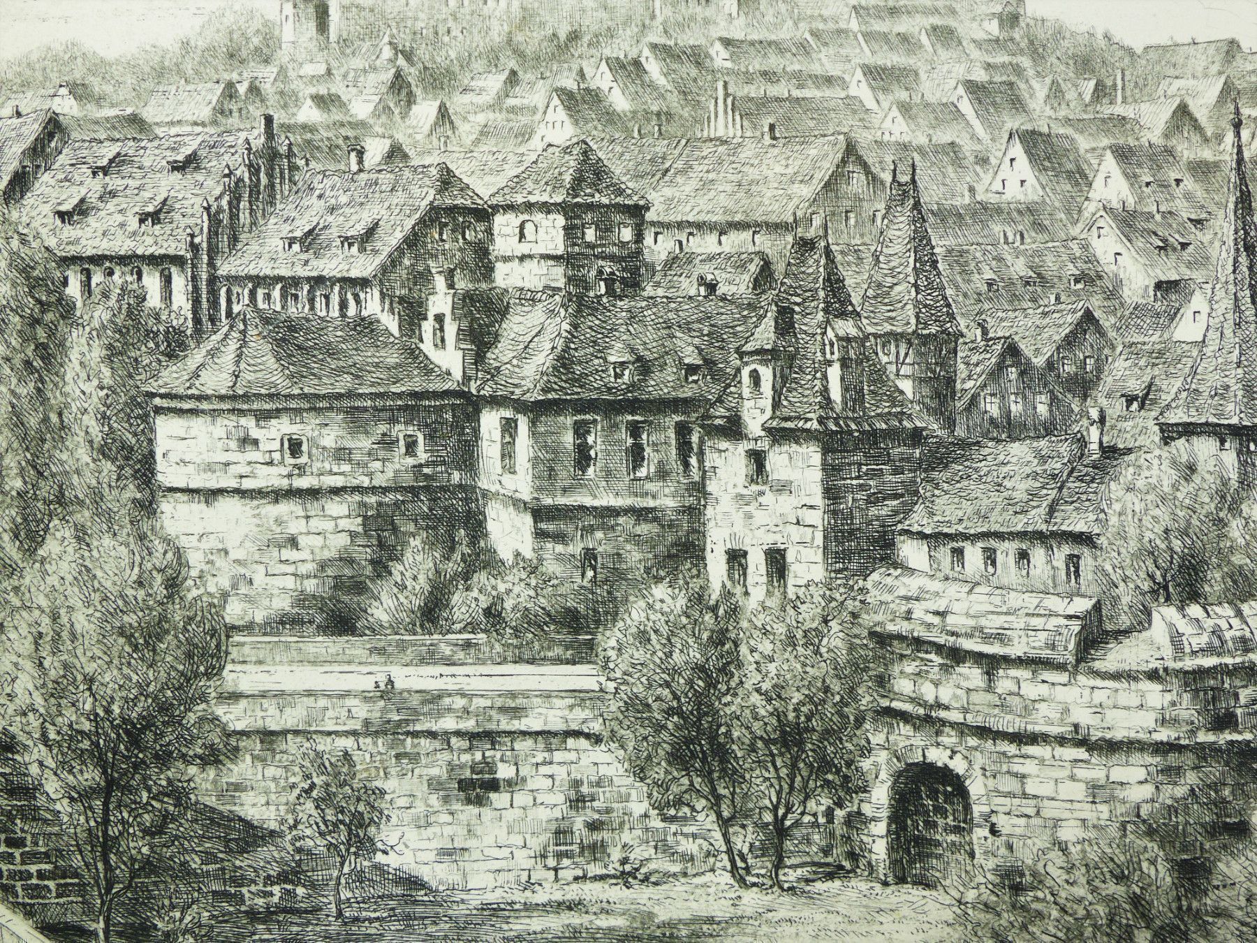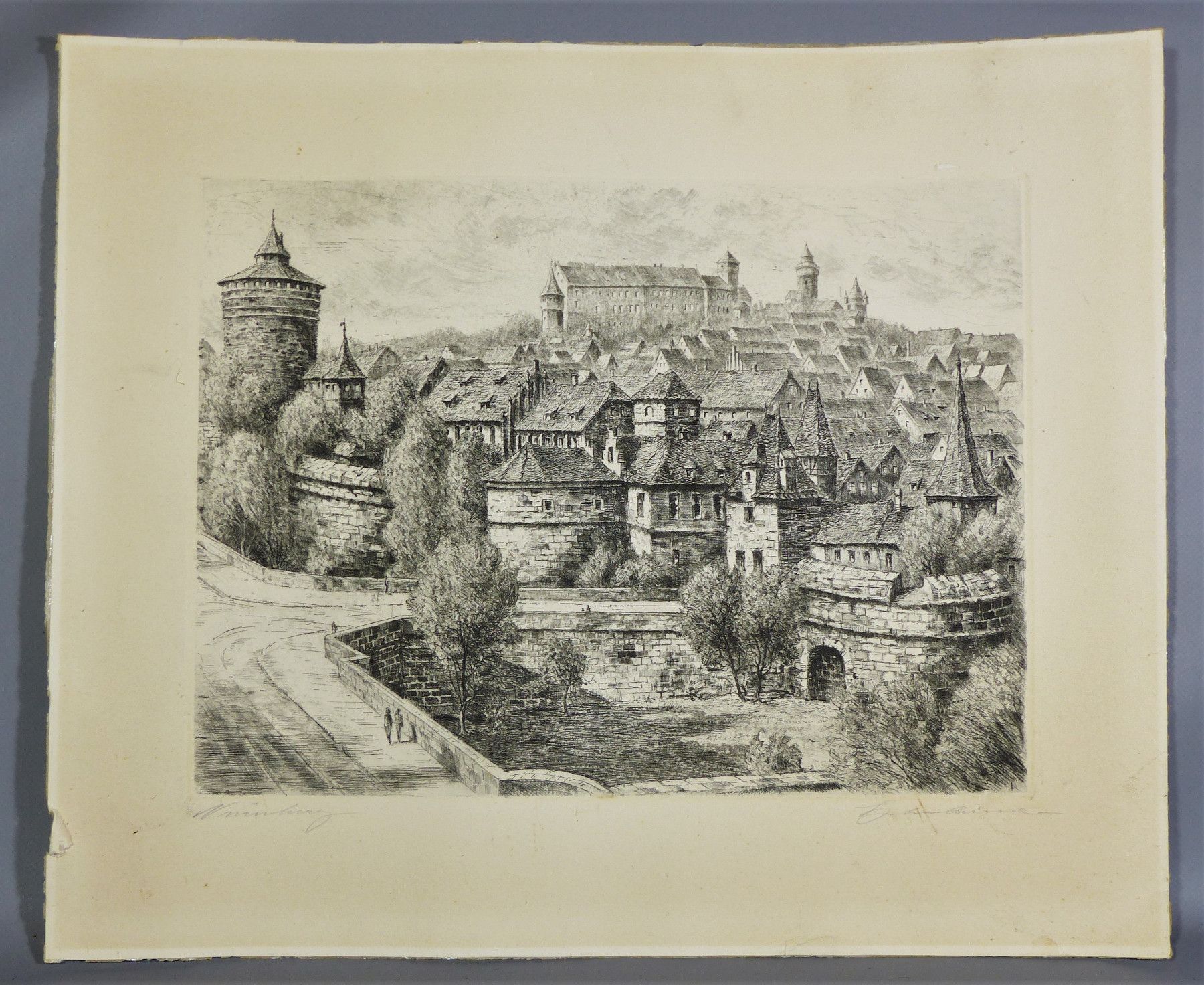 Original Kupferstich Stich Nürnberg Hallertor Burg Altstadt Bild signiert antik