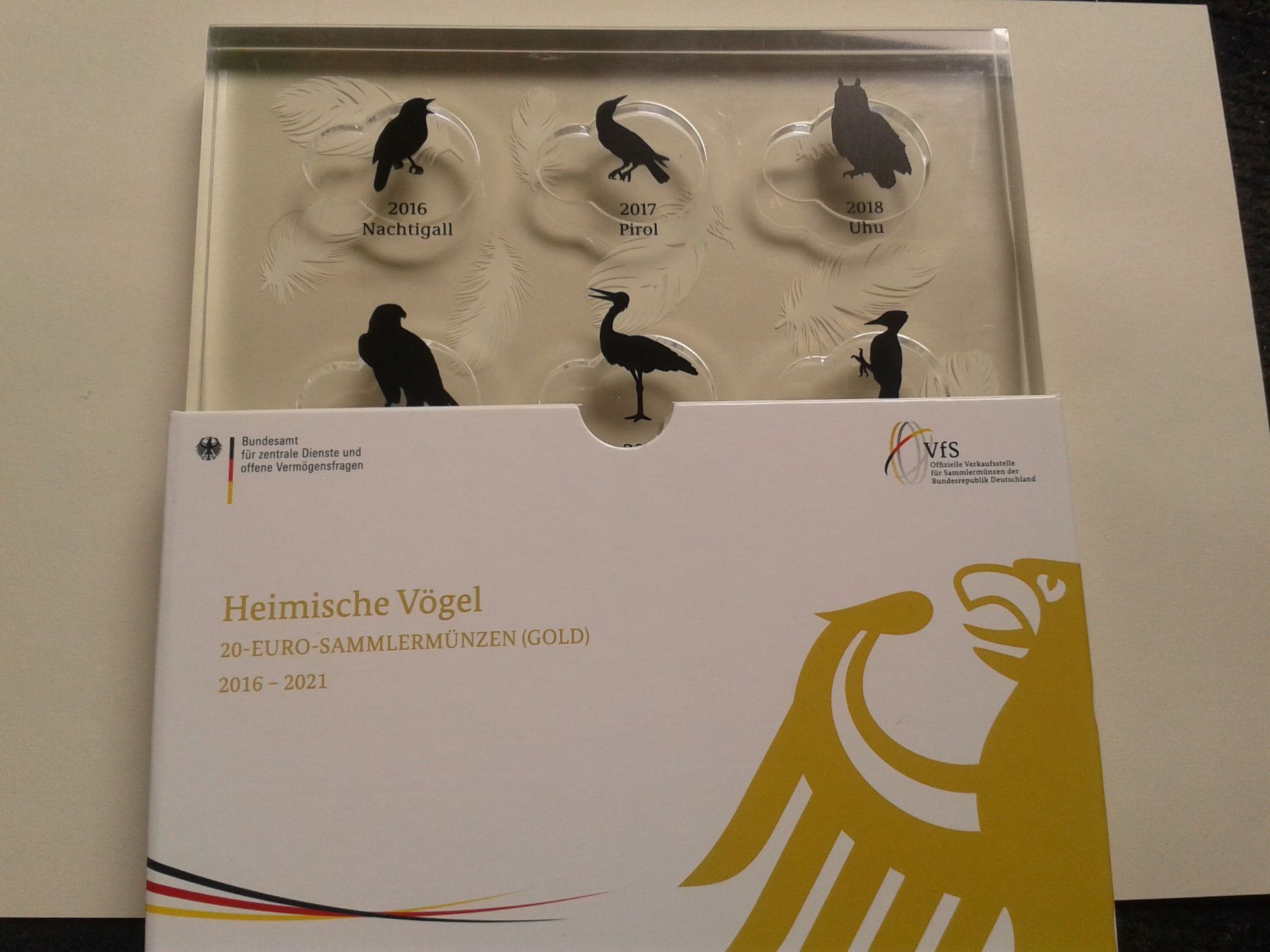 Originalbox für die komplette Serie. Original Plexiglas Acrylglas Box Etui für die 20 eurp Gold Serie Heimische Vögel bei Fragen: