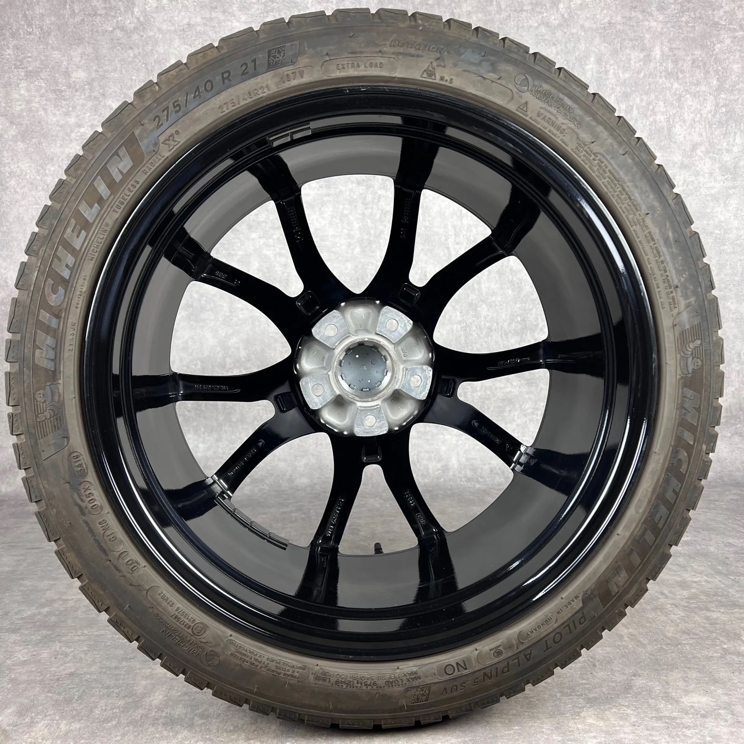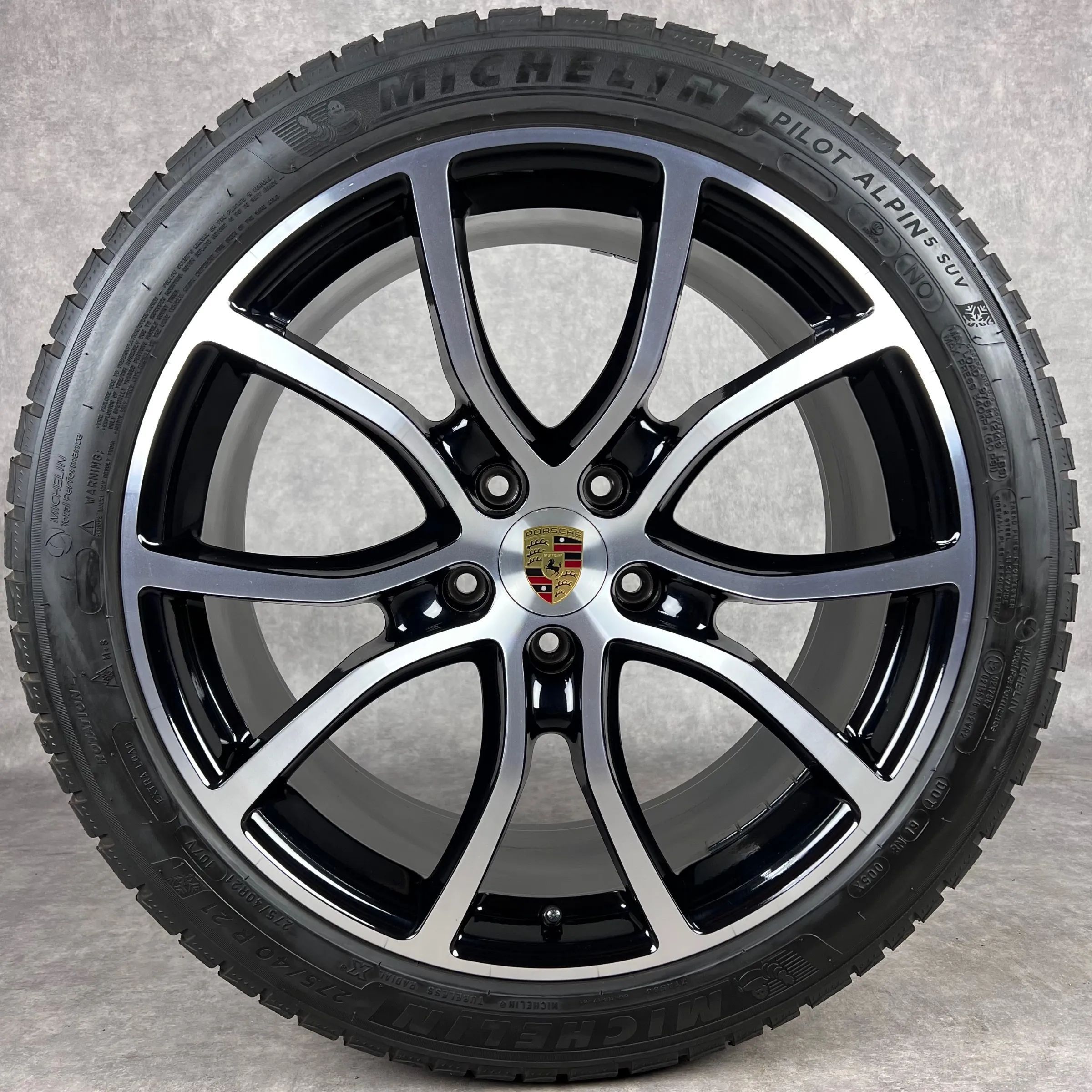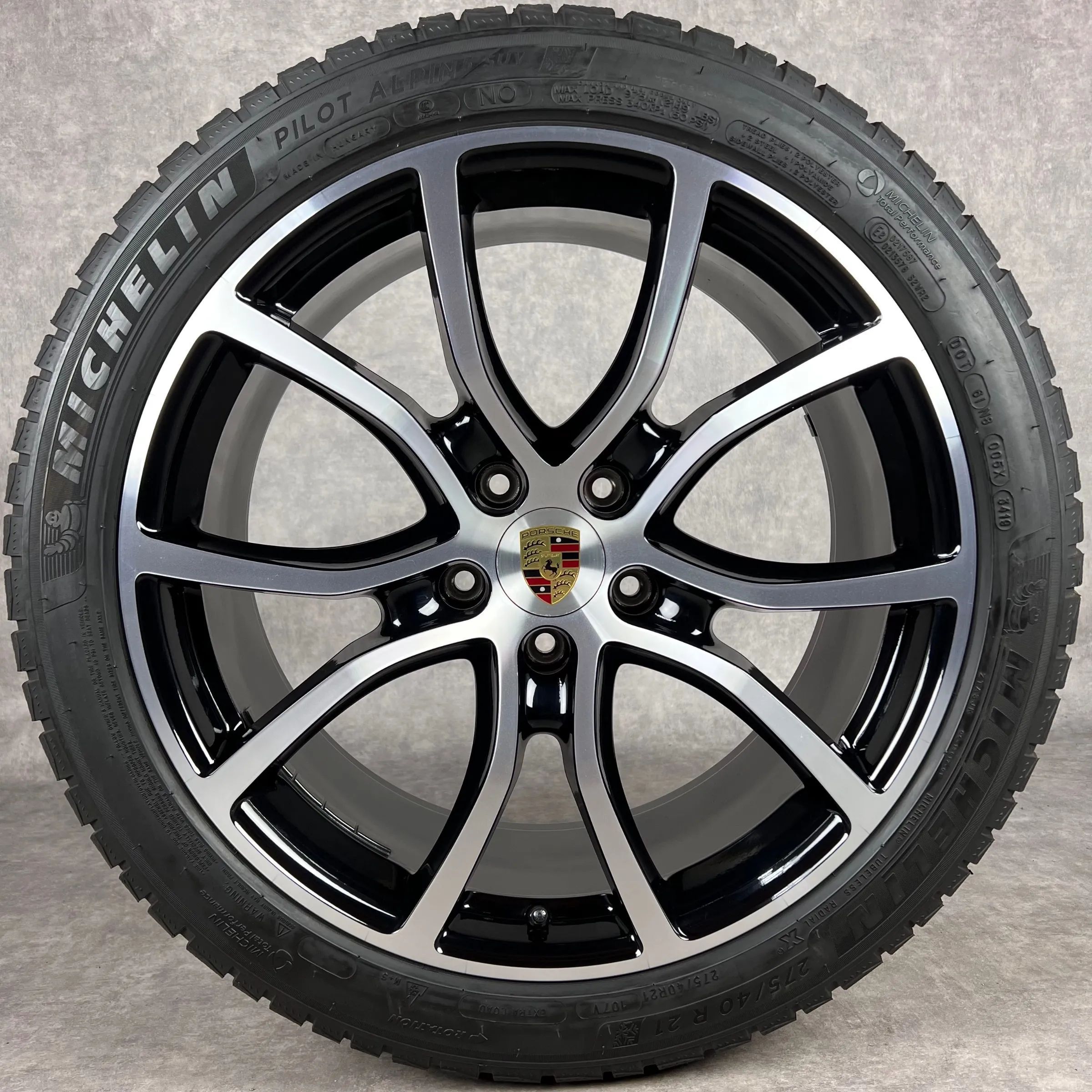 4x Original PORSCHE Cayenne (E3) 21 Exclusive Design Felgen Winterkompletträder schwarz hochglanz inkl. glanzdrehbereiche Original Lack VA Dimension: 9,5Jx21 ET46 Teilenummer: 9Y0601025BH 275 40 R21 107V Michelin Pilot Alpin PA5 N0, gebraucht, Profil 7,3mm HA Dimension: 11Jx21 ET58 Teilenummer: 9Y06