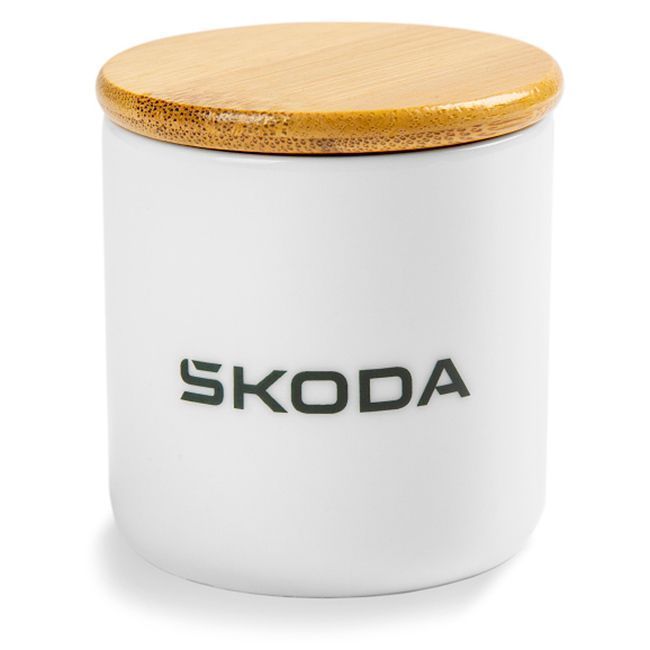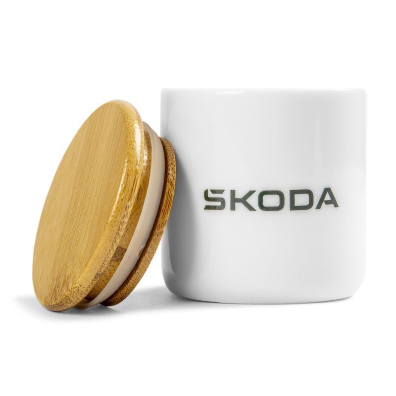 Original Skoda Kerze Bienenwachs Keramikgefäß weiß Bambusdeckel 6U0087790