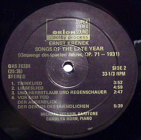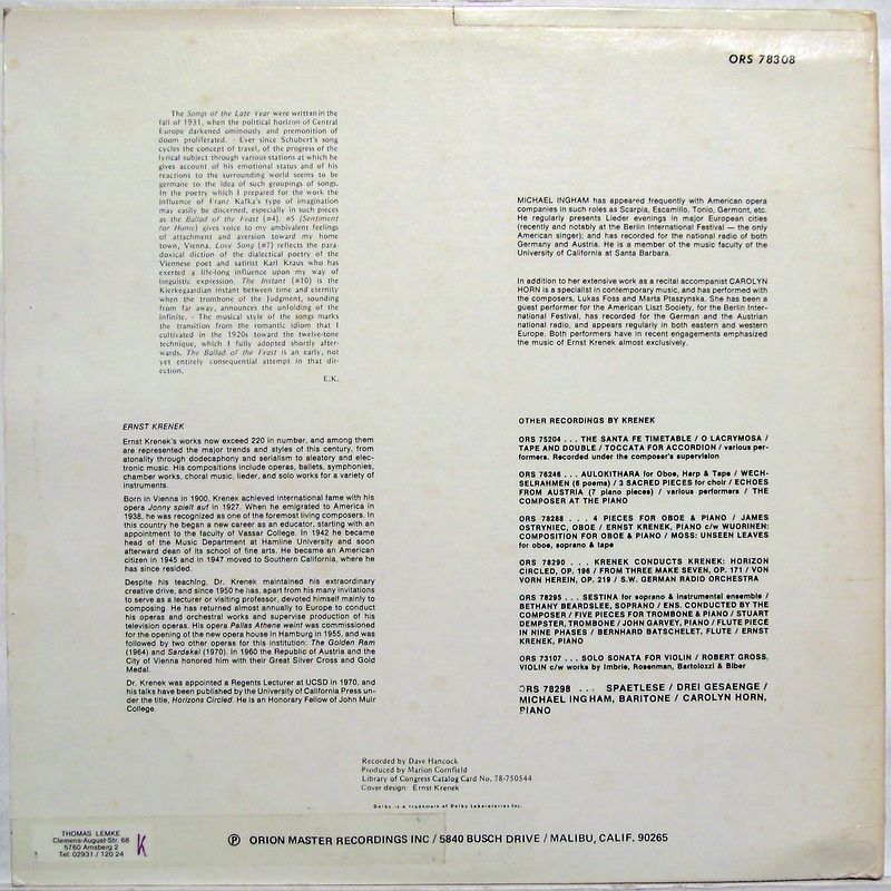 Orion ORS 78308 - Ernst Krenek - Gesaenge Des Spaeten Jahres, Songs Of The Late