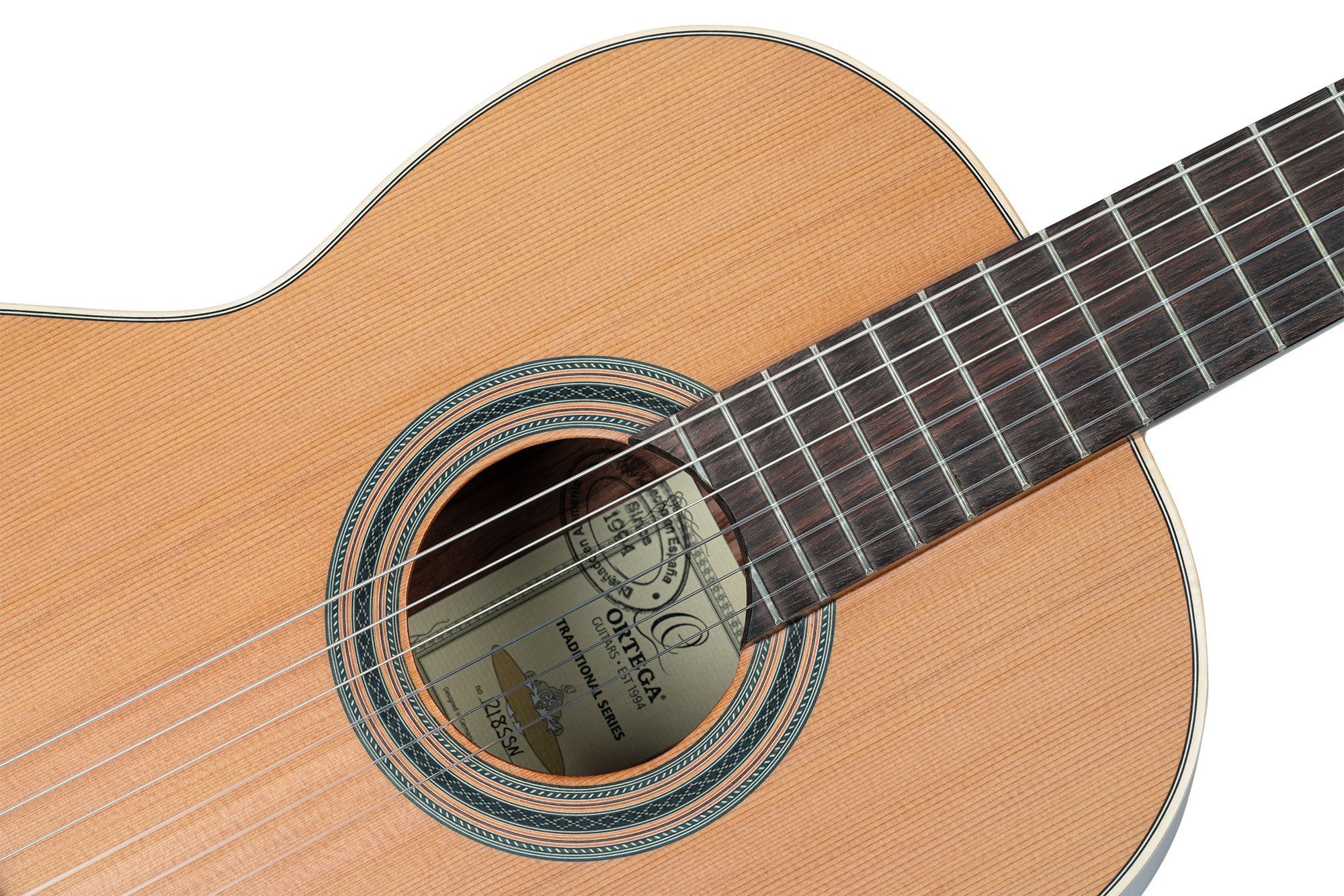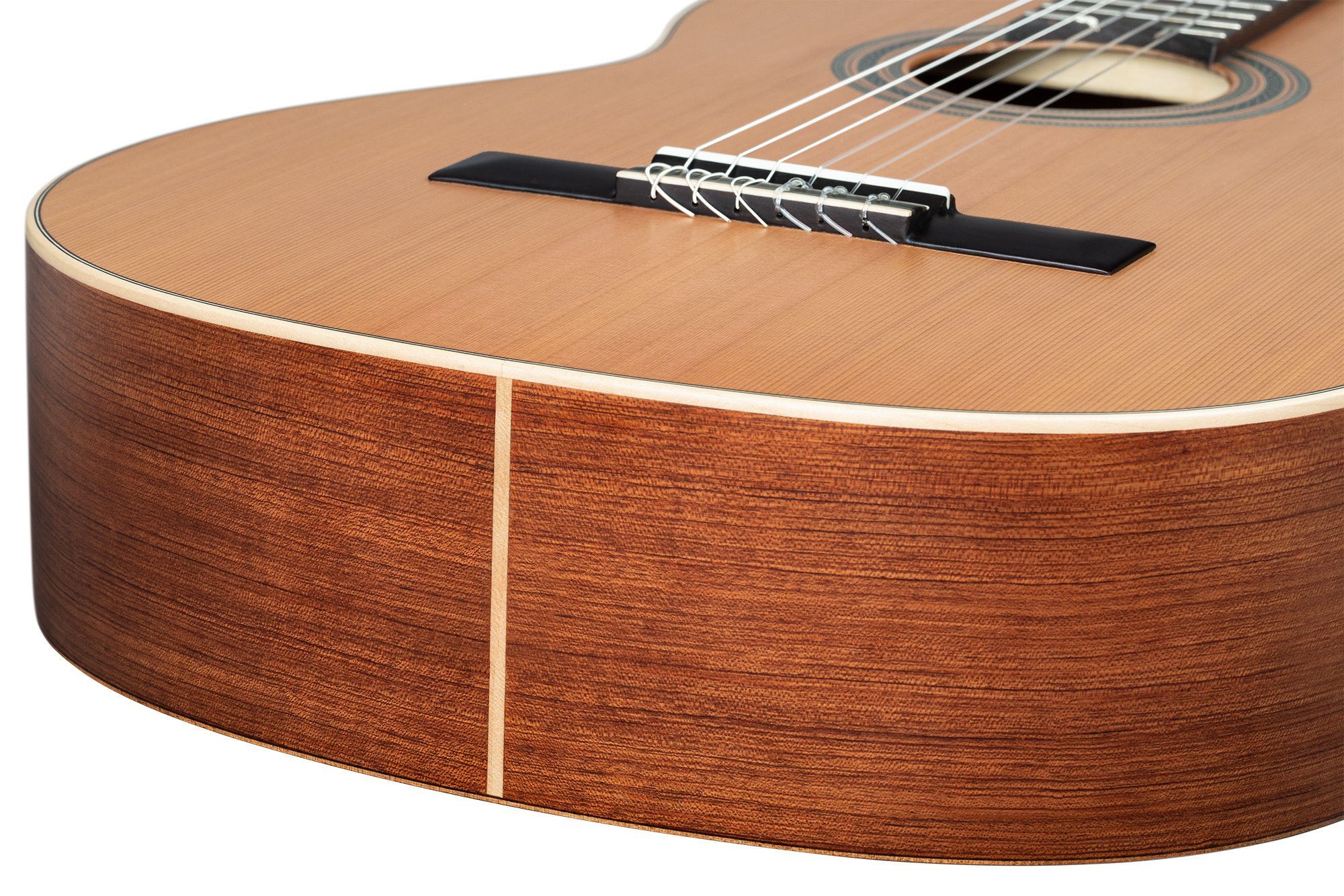 Ortega R18SSN Decke: Zeder, massiv Boden und Zargen: Bubinga Hals: Afrikanisches Mahagoni Griffbrett: Palisander Mensur: 65 cm ( 25,6' ) Sattelbreite: 48 mm 19 Bünde Steg: Palisander Mechaniken: Chrom Lyra-Design, weiße Knöpfe Saiten: Knobloch EDQ 34.0 MED HIGH Tension Farbe: Natur Finish: Satin Her