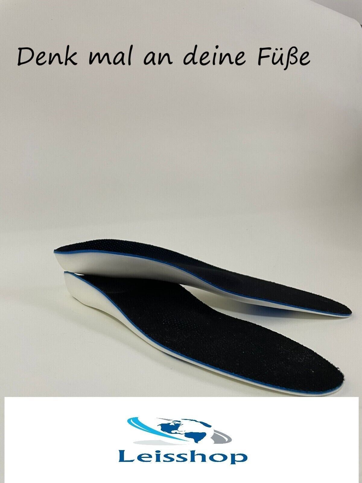 Leis-Fußbett 1) Anatomisch, superelastisch geformte PU-Einlage mit Pelotte für Schuhe mit herausnehmbaren Fußbett. 2) Original Fußbett entfernen und anatomisch geformtes Leis-Fußbett einlegen 3) schwarzer Spezialstoff mit Supersoftpolster blau + Vor-und Rückfußpolster Orthopädische Einlagen sind spe