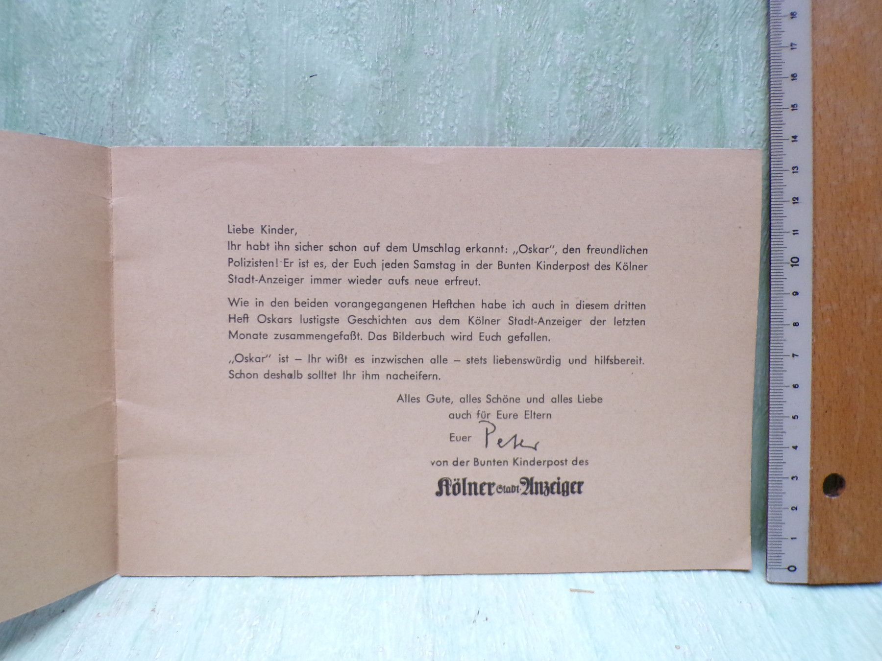 Jugend- & Kinderbücher ua ... Erinnerungen ..... Oskar der freundliche Polizist gezeichnet von Schwalge heruasgegeben vom Kölner Stadtanzeiger Euer Peter von der Bunten Kinderpost . Zustand : gut++ . . . . Abkürzungen: Buchschnitt : BS fleckig Buchecken : BE geknickt Buchrücken : BR beschädigt S