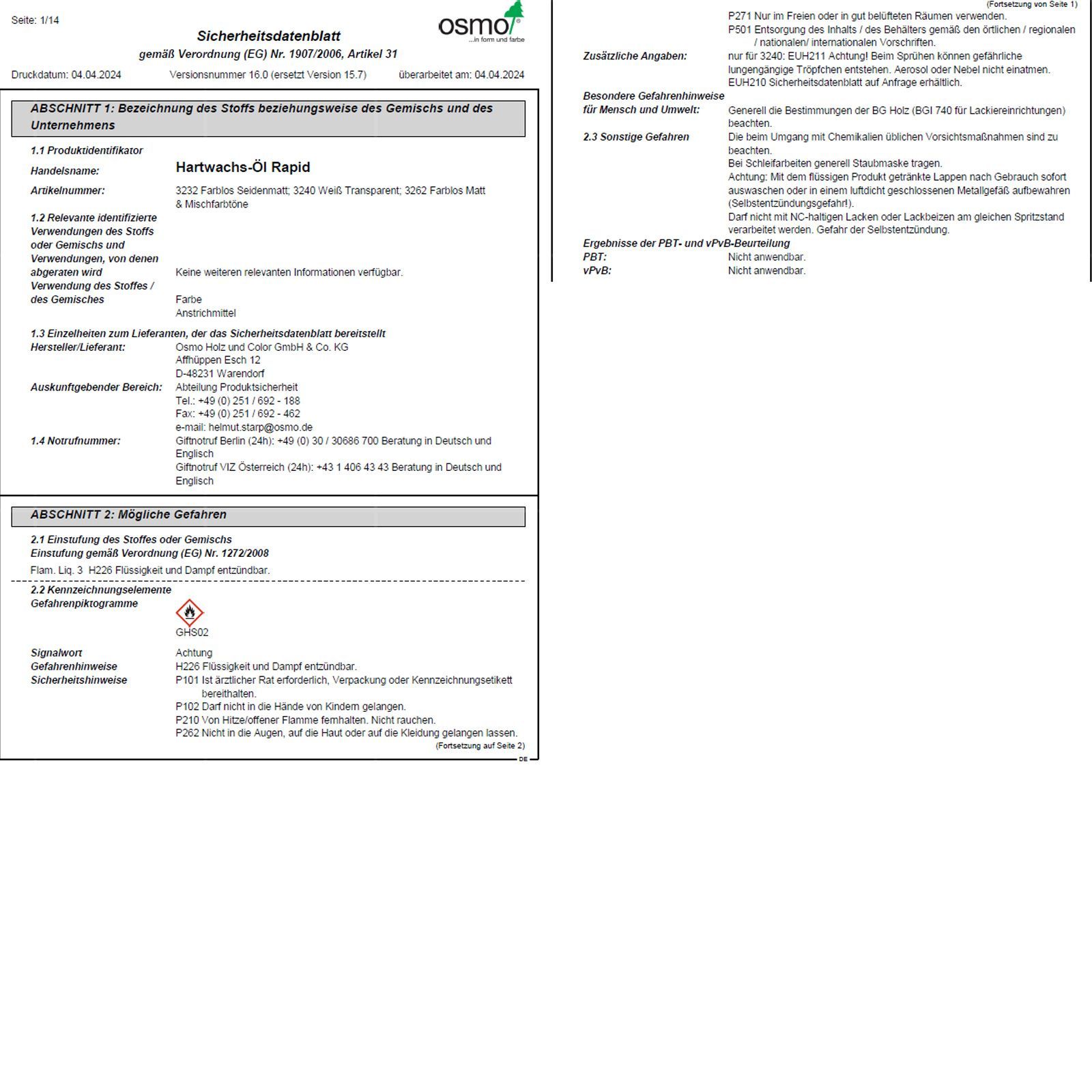 • Flüssigkeit und Dampf entzündbar.