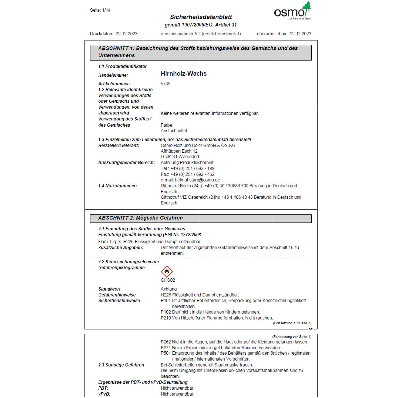 OSMO Hirnholz-wachs - 0.375 LTR (FARBLOS) Holzschutz Holzpflege FÜR AUSSEN