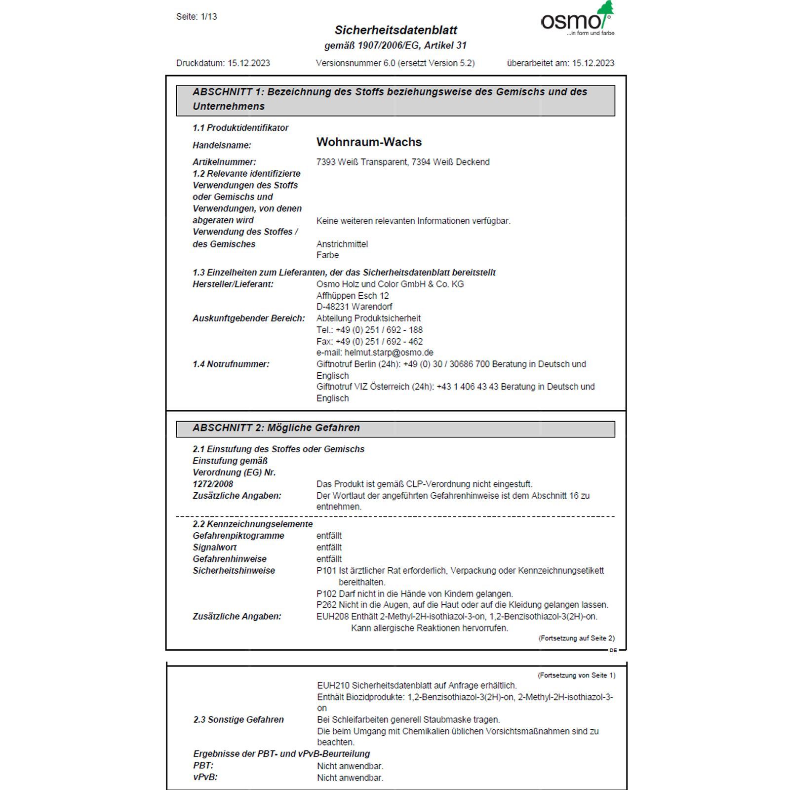 OSMO Wohnraum-wachs 2.5 Ltr WEISS Holzschutz Innenbereich transparent / deckend