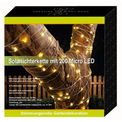 • Solar-Lichterkette 200 Micro-LEDs 21,9m Warmweiß Gartenbeleuchtung Terrassendeko