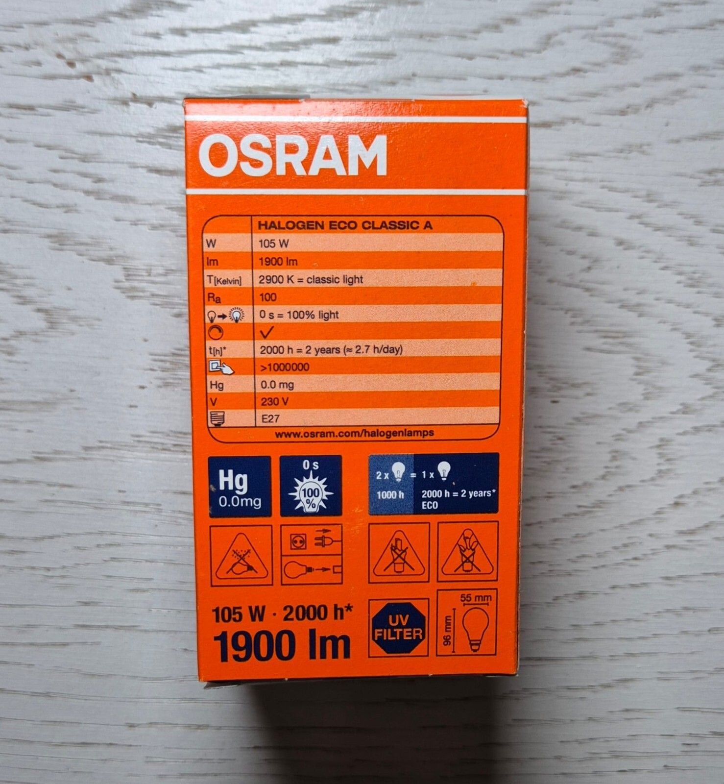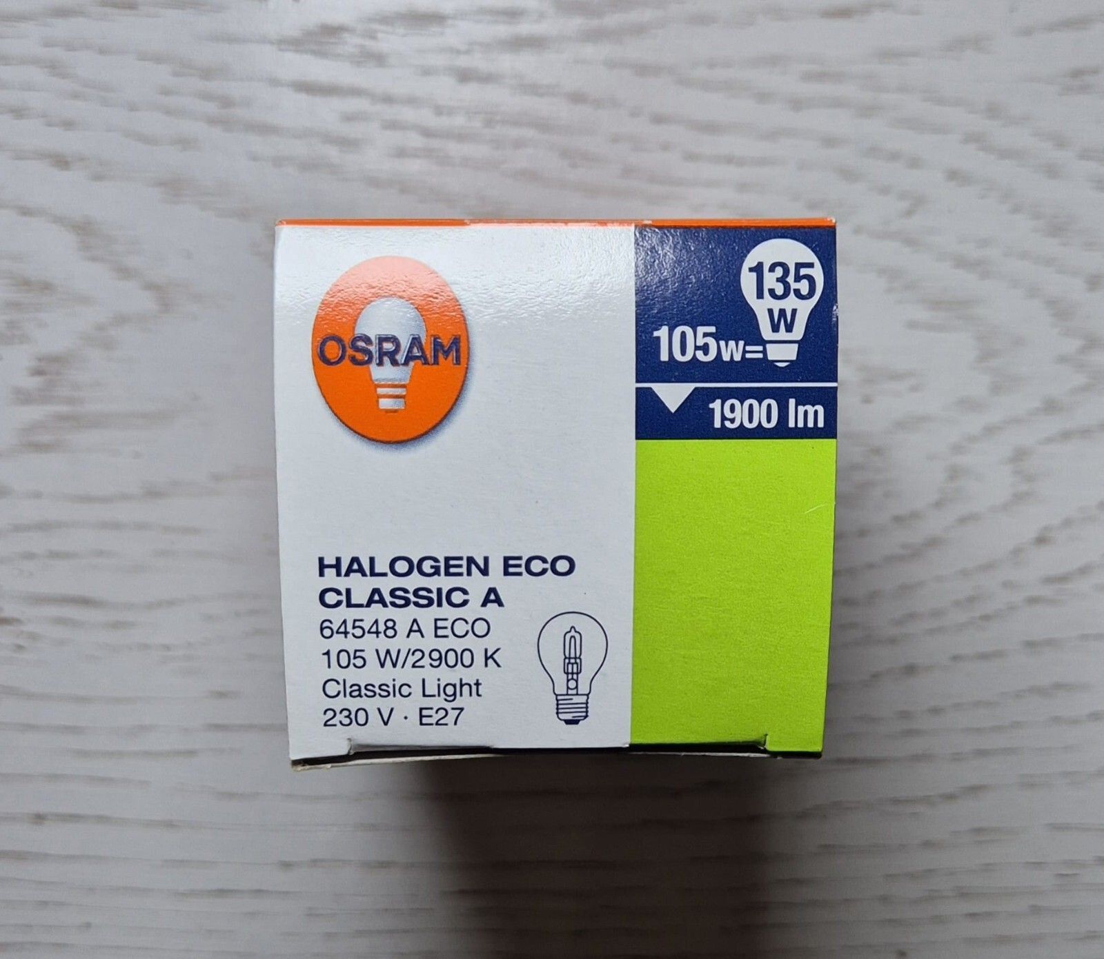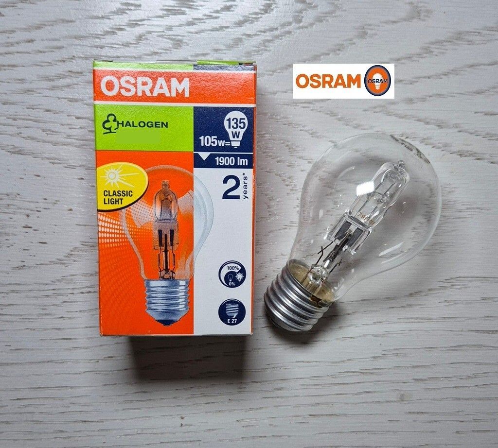 Osram Classic Halogen 105W Die Classic A 105W ist eine Halogen-Glühbirne von Osram. Lichtstrom: 1900 Lumen - sehr helles Licht Lebensdauer: 2000 Stunden Farbtemperatur: 2900 K - Warmweiß Sockel: E27 Länge (mm) 96, Breite (mm) 55