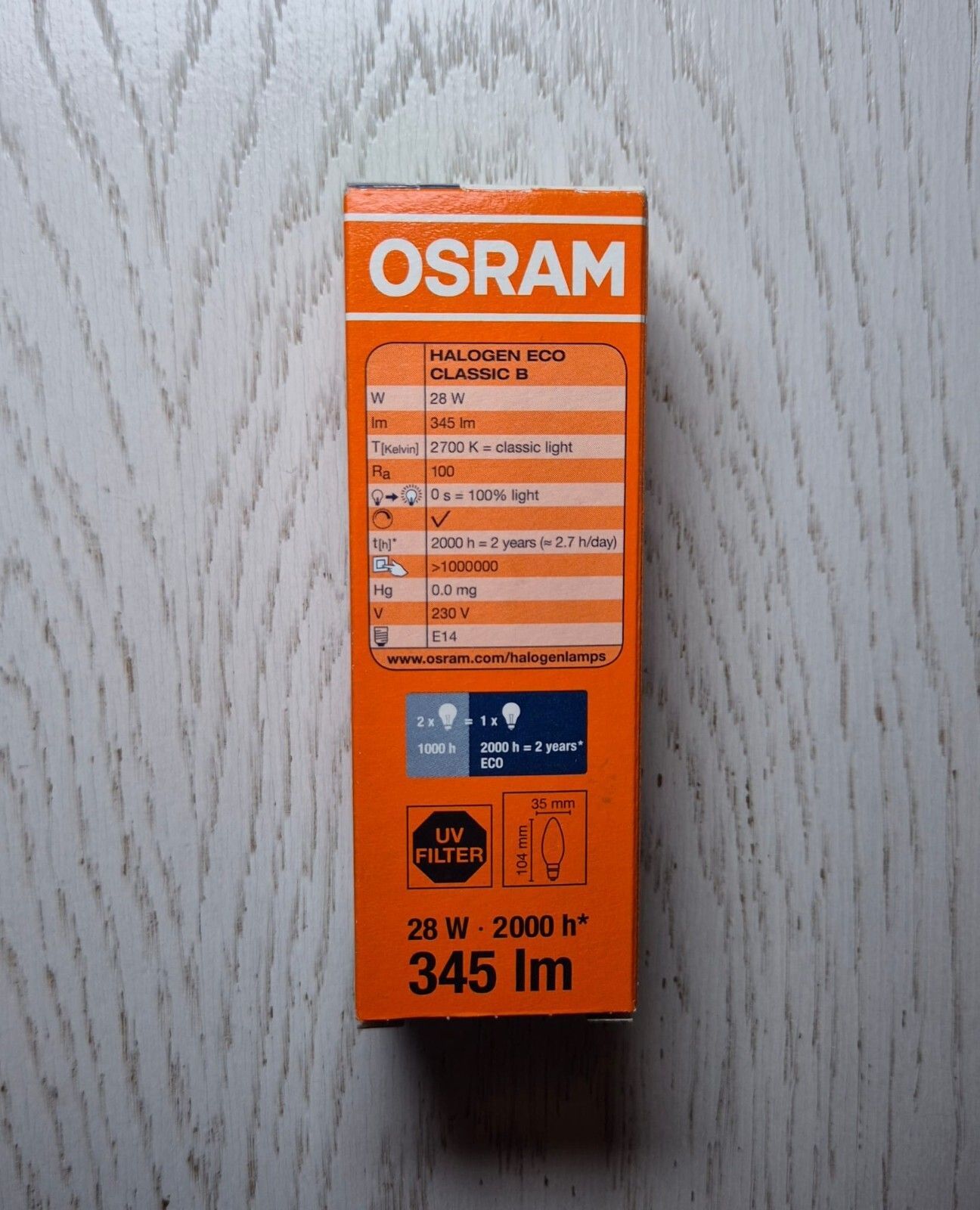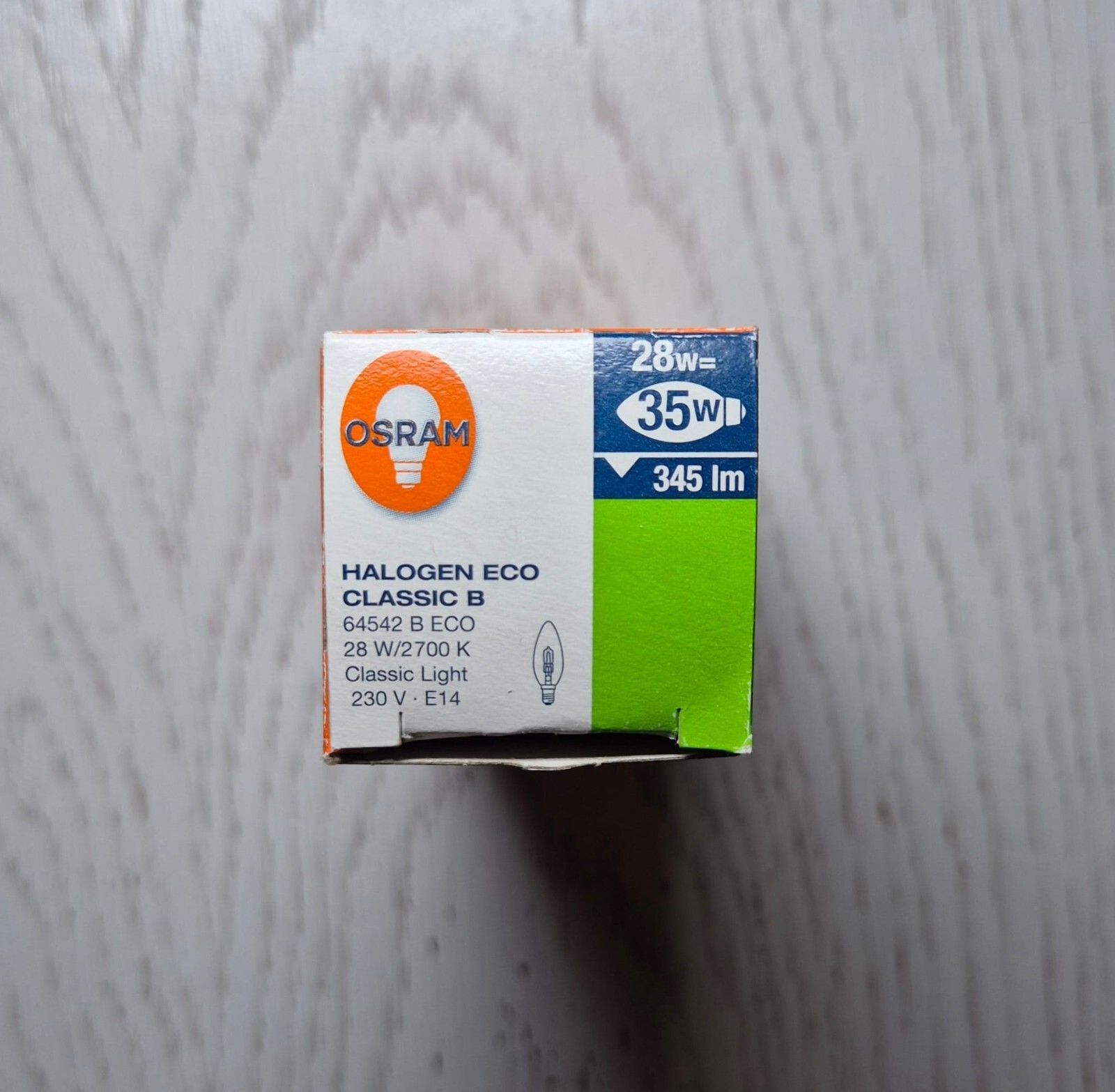 Osram Classic 28W Kerze Die Classic B 28W ist eine Halogen-Glühbirnen-Kerze von Osram. Lichtstrom: 345 Lumen Lebensdauer: 2000 Stunden Farbtemperatur: 2700 K - Warmweiß Sockel: E14 Länge (mm) 104, Breite (mm) 35
