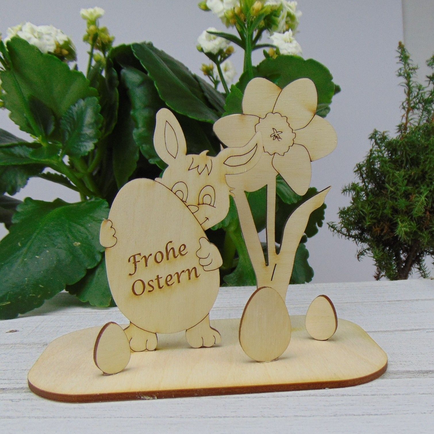 Ostereier aus Holz mit der Aufschrift " Frohe Ostern " Die Tischdeko Ostern liefern wir mit einer Unterplatte in der Größe 128 x 55 mm zum Hinstellen, einem Osterei mit ausgeschnittenen Osterhasen und einer Narzisse plus 3 Eier Graviert mit Frohe Ostern Sie erhalten insgesamt 6 Teile, die zusammengesteckt und für eine Langlebigkeit geklebt werden können. Unser kreatives Geschenkeset besteht aus 3 mm Naturholz, naturbelassen und kann mit Acrylfarben oder Poscastiften bemalt werden.