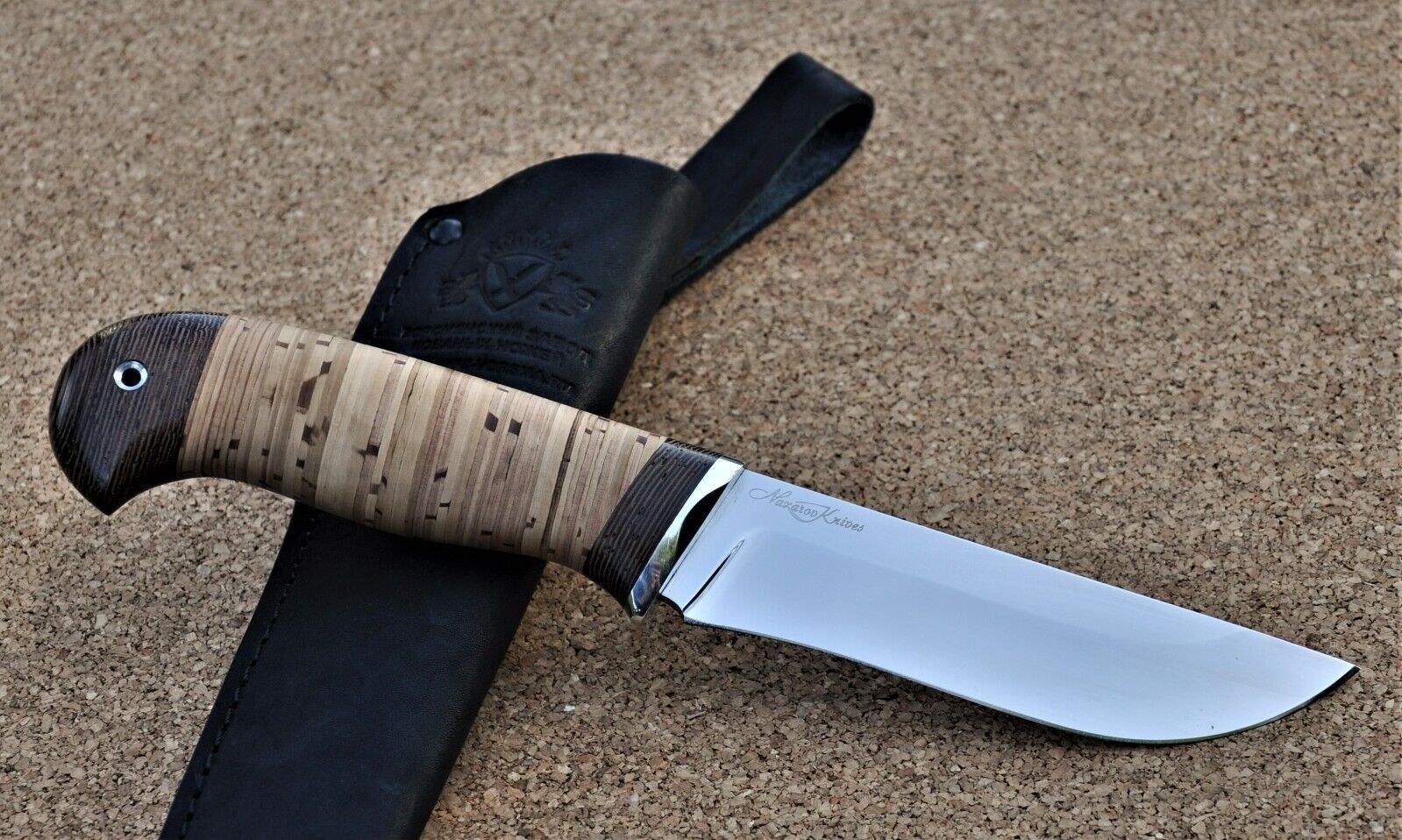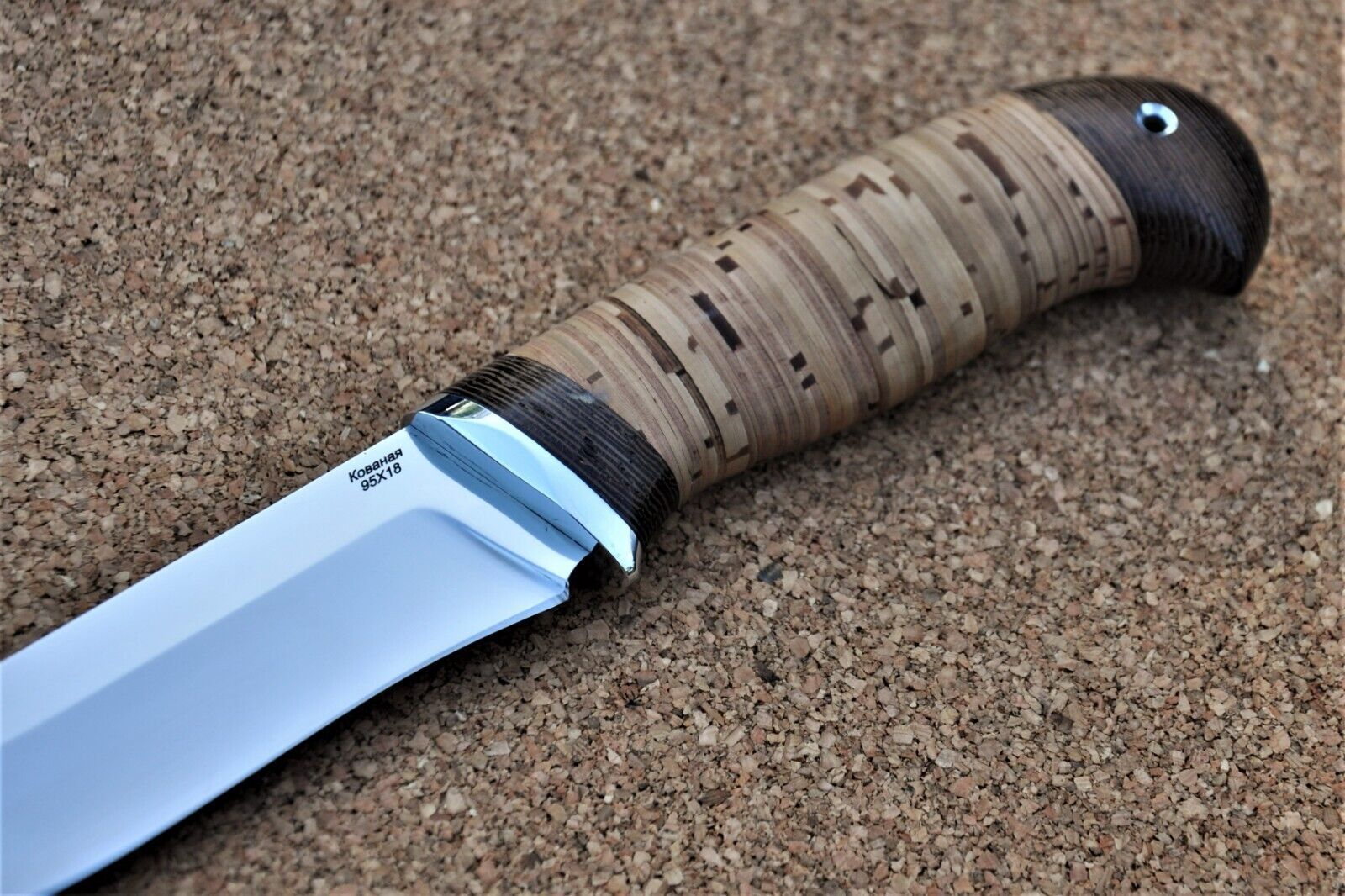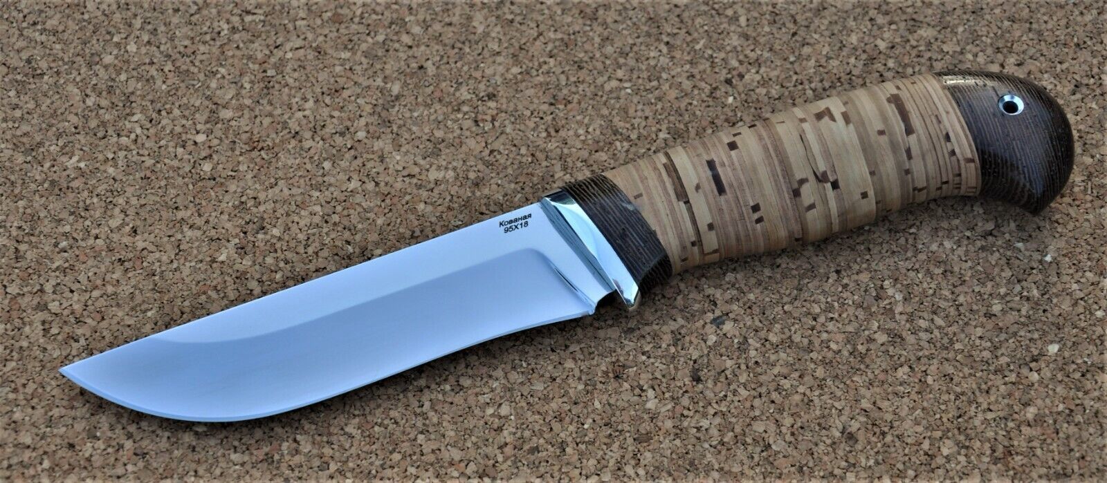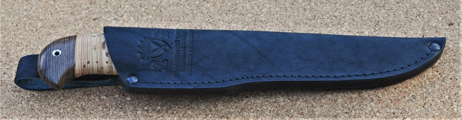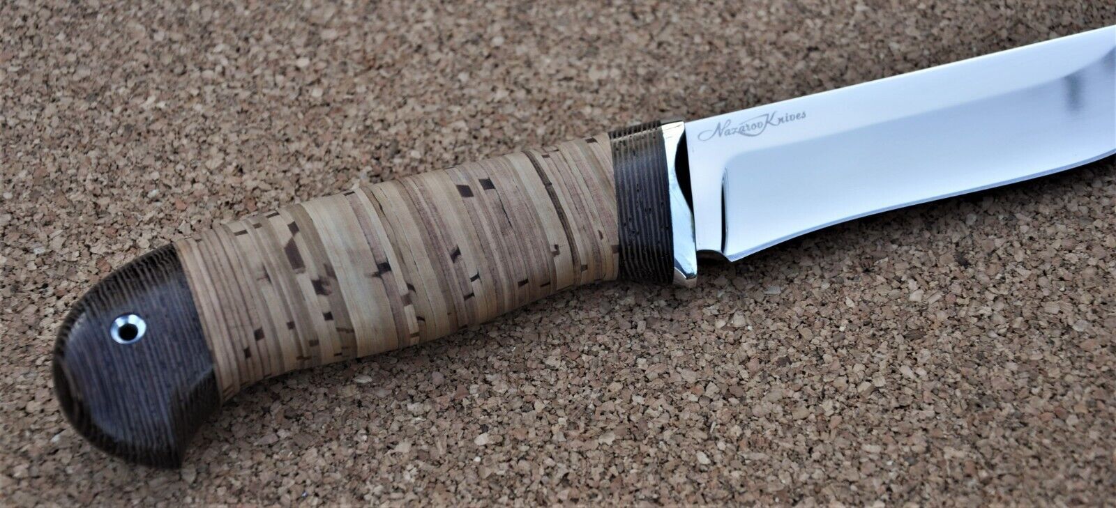 Zum Verkauf steht ein Messer aus rostfreiem Stahl 95H18 der Firma Nazarov Knives aus Russland. Parameter: Messerlänge: ca. 250 mm Klingenlänge: ca.123 mm Rückenstärke: ca. 2,5 mm Klingenbreite: ca. 32 mm Stahl: 95H18 (95X18) Griffmaterial: Birkenrinde+Wenge+Alu Gewicht: ca. 134 Gramm HRC: 60 Das Mes