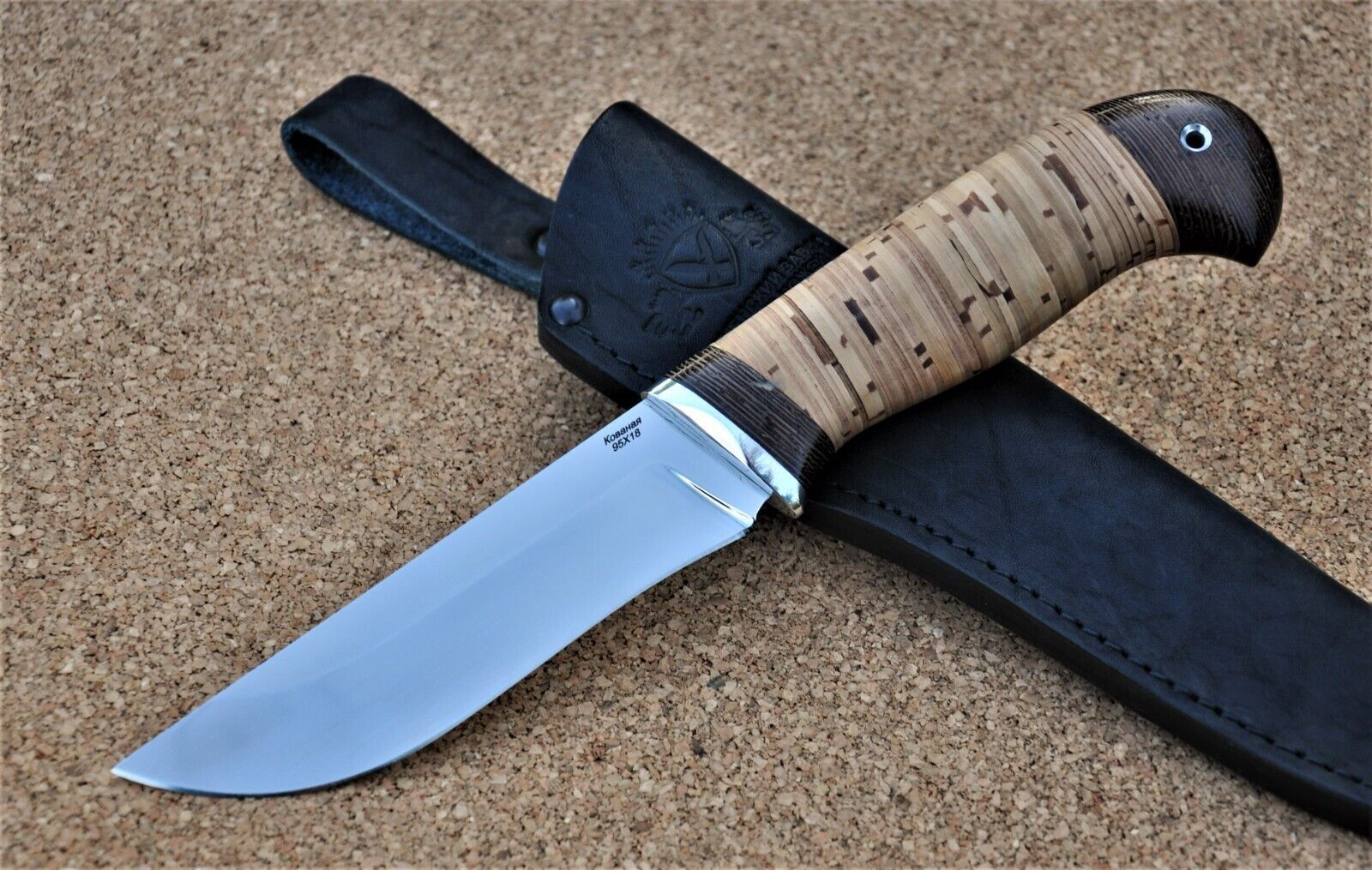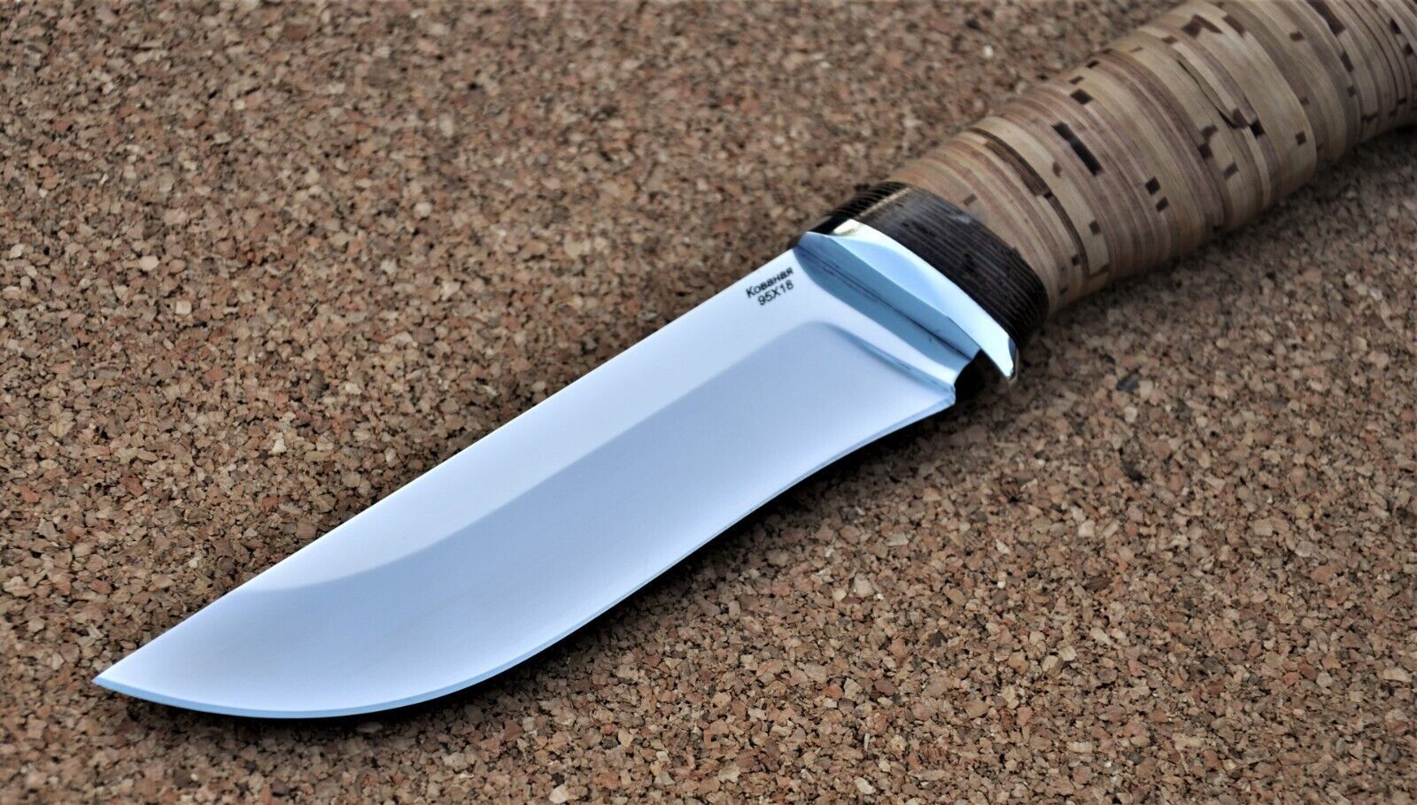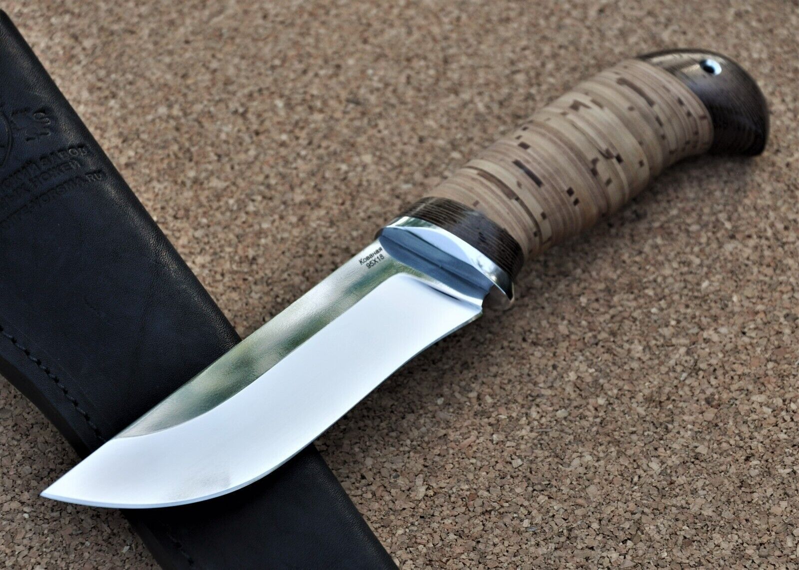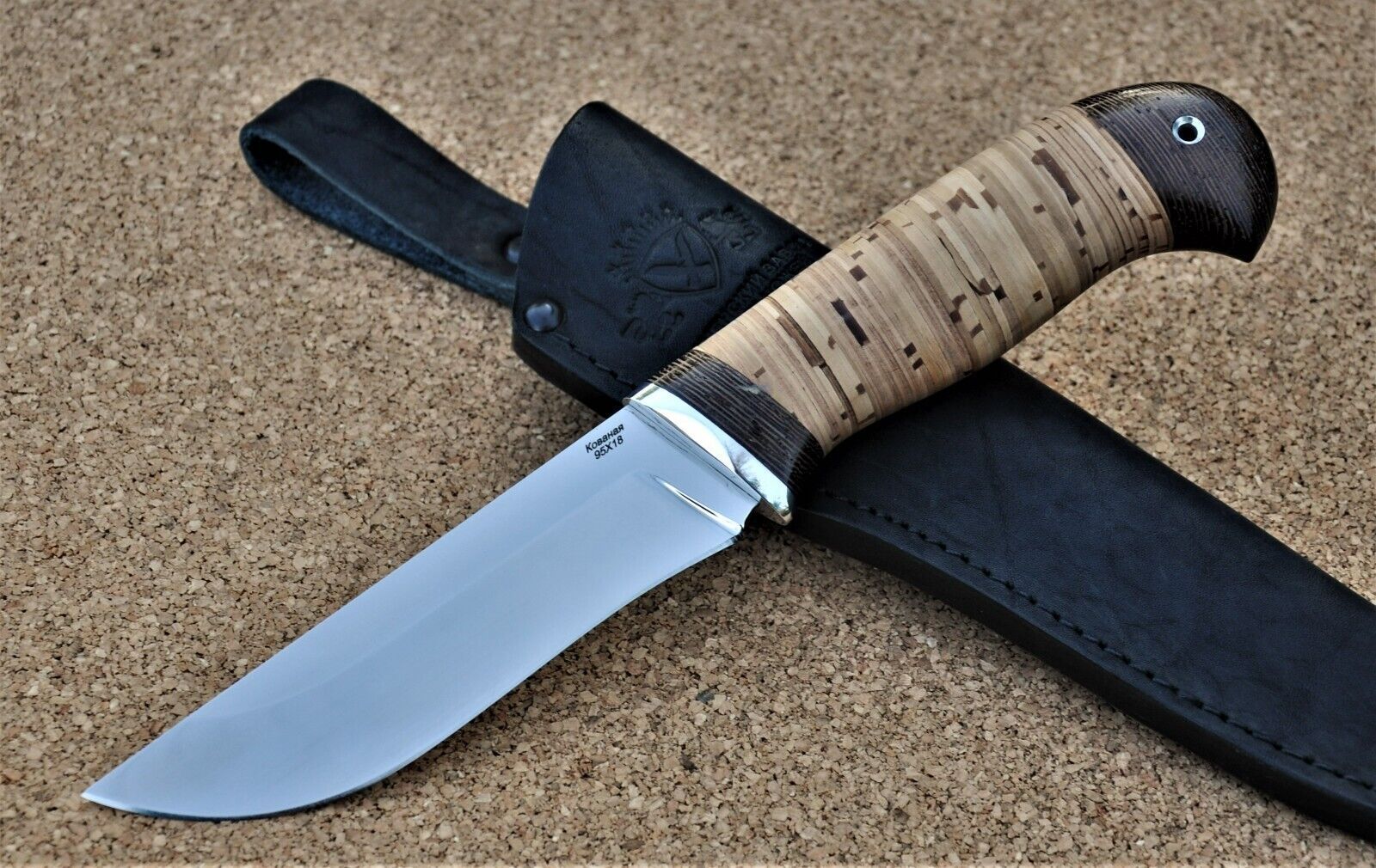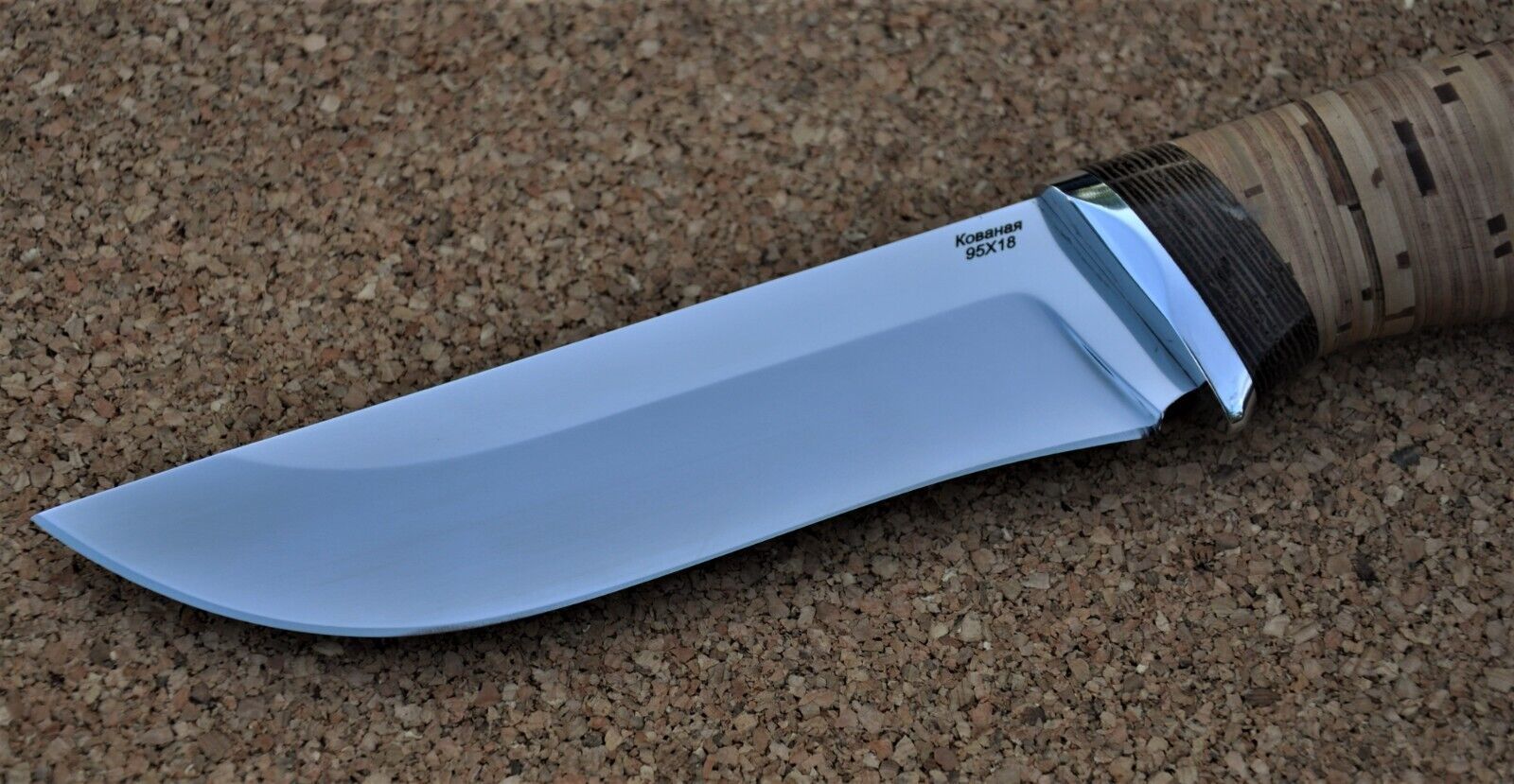 Zum Verkauf steht ein Messer aus rostfreiem Stahl 95H18 der Firma Nazarov Knives aus Russland. Parameter: Messerlänge: ca. 250 mm Klingenlänge: ca.123 mm Rückenstärke: ca. 2,5 mm Klingenbreite: ca. 32 mm Stahl: 95H18 (95X18) Griffmaterial: Birkenrinde+Wenge+Alu Gewicht: ca. 134 Gramm HRC: 60 Das Mes