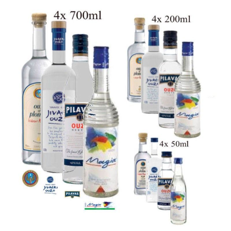 Ouzo Probierset 3,8 Liter Plomari Pilavas Magia Jivaeri original 40%ige Abfüllungen