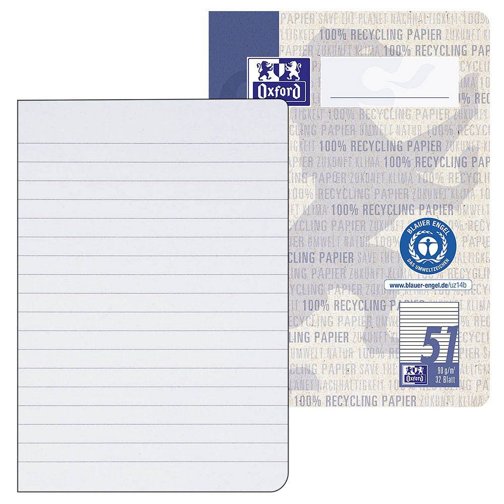 Oxford OXFORD 400159445 Schulhefte Recycling Lineatur 52 liniert DIN A6 ohne Rand, 32 Blatt