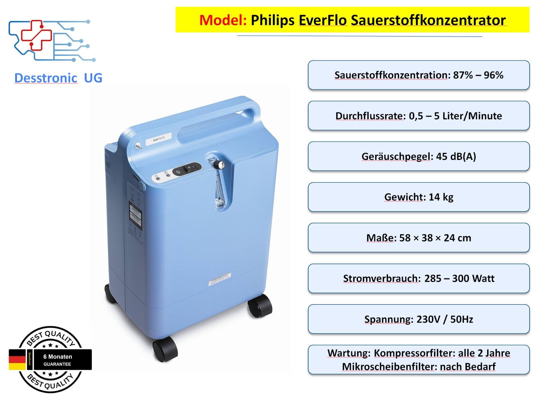 Zuverlässiger Philips EverFlo™ Sauerstoffkonzentrator – leise, energiesparend, komplett gereinigt & getestet. Inkl. Zubehör & 6 Monate Garantie durch Desstronic UG.