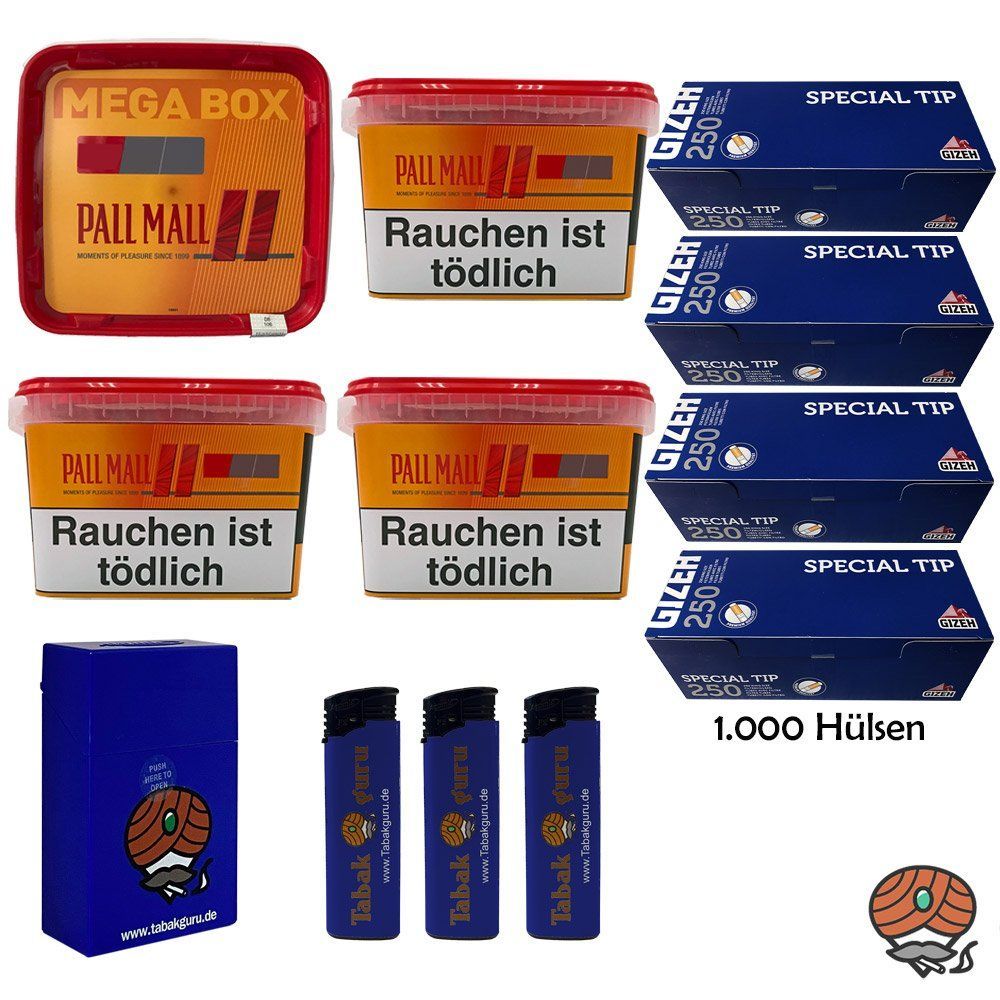 4 x Pall Mall Allround Volumentabak Mega Box Eimer + 1.000 Gizeh Special Tip Filterhülsen + 3 Feuerzeuge (nicht wählbar) + 1 Zigarettenbox (nicht wählbar) Tabak: Pall Mall Allround Tabak ist ein reichhaltiger American Blend Zigarettentabak Stopftabak bestehend aus ausgesuchten Virginia-, Burley- und
