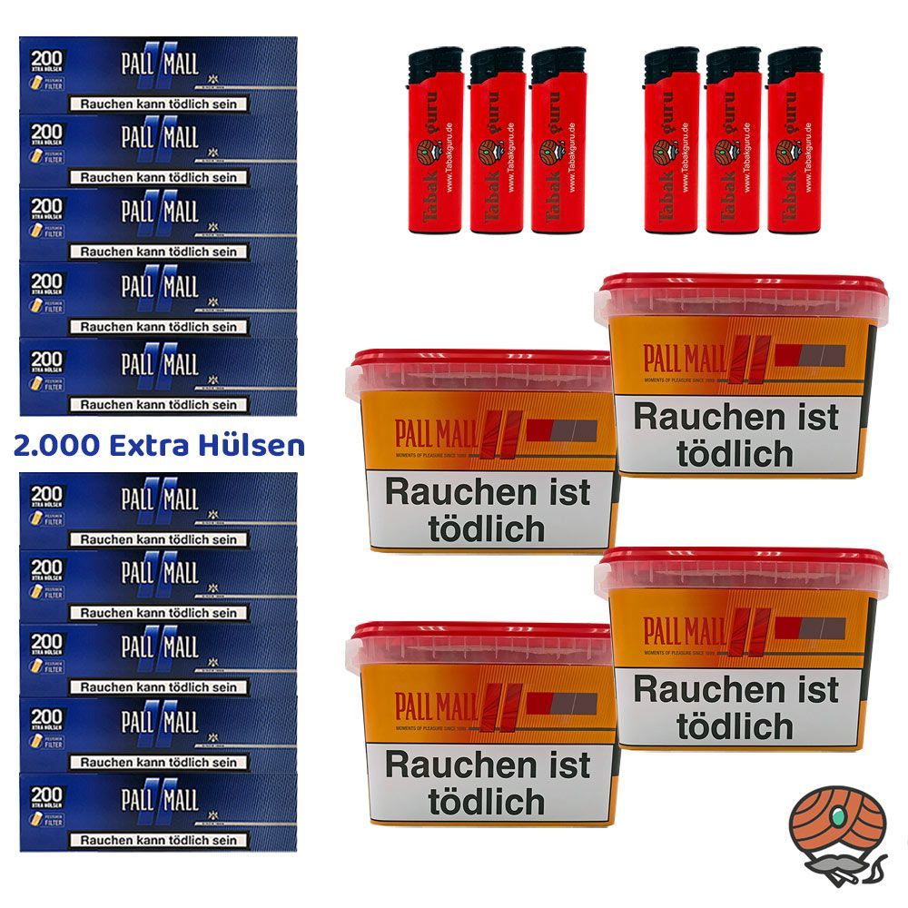 4 x Pall Mall Allround Volumentabak Mega Box Eimer + 2.000 Pall Mall Blue Xtra Filterhülsen + 6 Feuerzeuge (nicht wählbar) Tabak: Pall Mall Allround Tabak ist ein reichhaltiger American Blend Zigarettentabak Stopftabak bestehend aus ausgesuchten Virginia-, Burley- und Orienttabaken, die fein aufeina