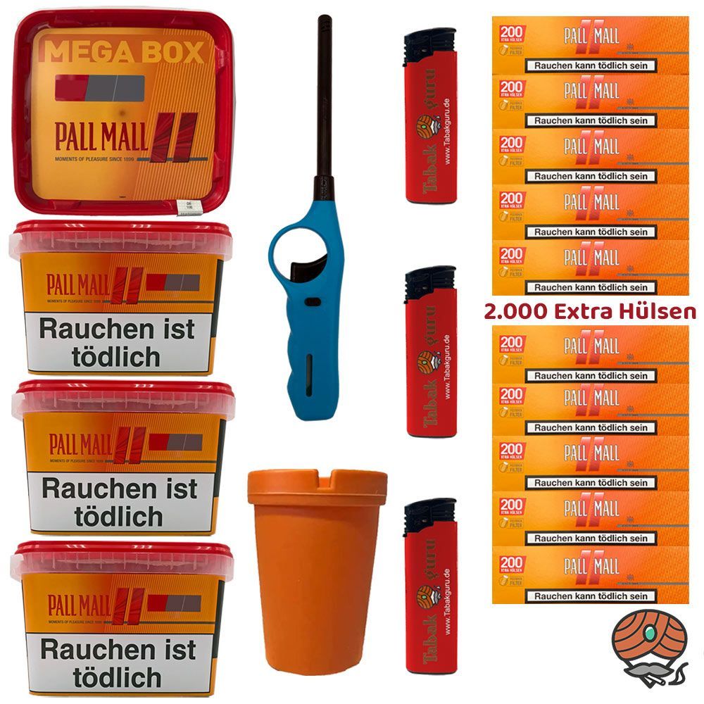 4 x Pall Mall Allround Volumentabak Mega Box Eimer + 2.000 Pall Mall Allround Xtra Filterhülsen + 3 Feuerzeuge (nicht wählbar) + 1 Stabfeuerzeug (nicht wählbar) + 1 Autoaschenbecher (nicht wählbar) Tabak: Pall Mall Allround Tabak ist ein reichhaltiger American Blend Zigarettentabak Stopftabak besteh