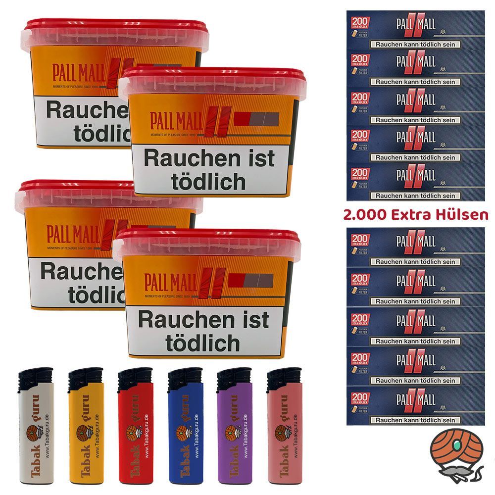 4 x Pall Mall Allround Volumentabak Mega Box Eimer + 2.000 Pall Mall Red Xtra Filterhülsen + 6 Feuerzeuge (nicht wählbar) Tabak: Pall Mall Allround Tabak ist ein reichhaltiger American Blend Zigarettentabak Stopftabak bestehend aus ausgesuchten Virginia-, Burley- und Orienttabaken, die fein aufeinan