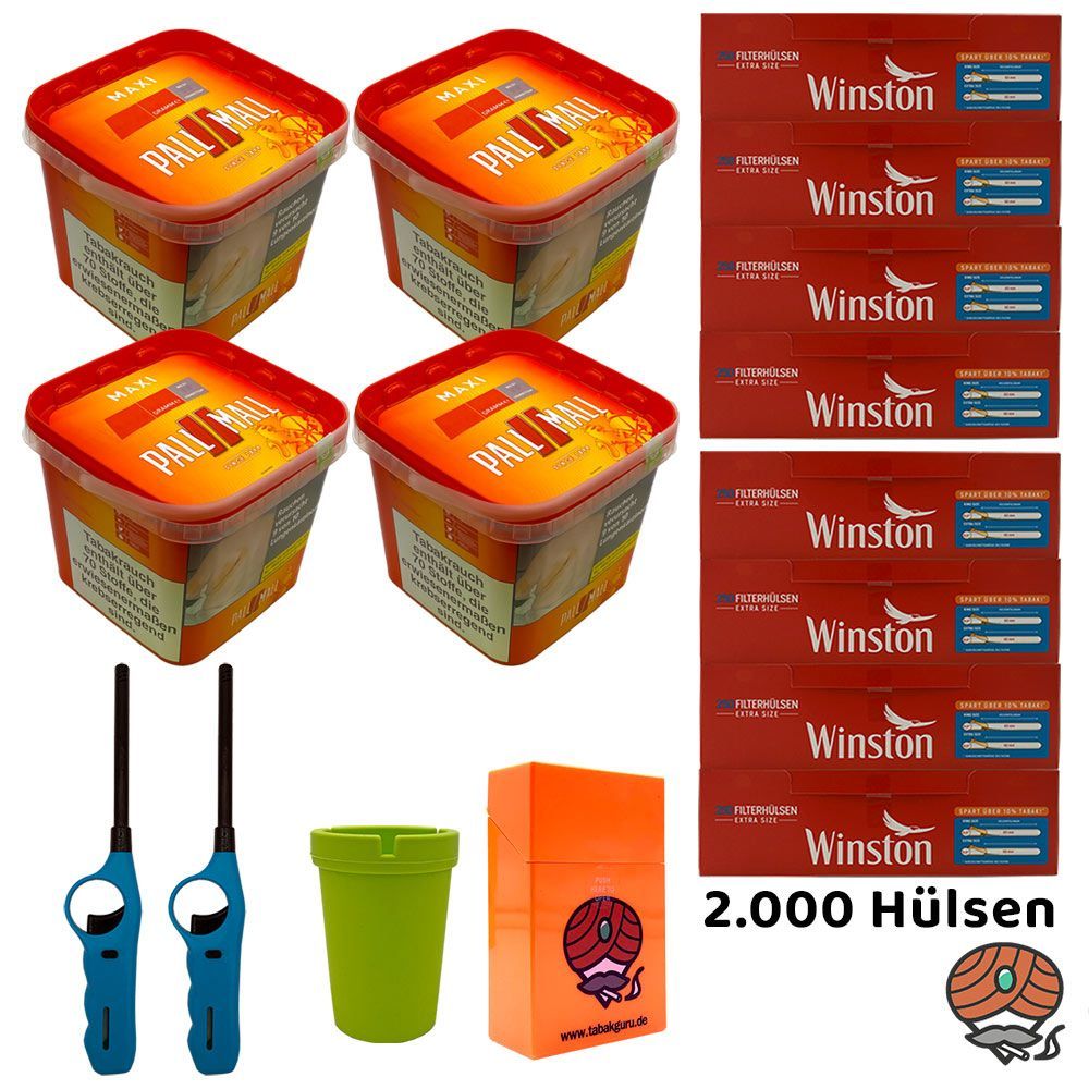 4 x Pall Mall Allround Volumentabak Maxi Box + 2.000 Winston Extra Filterhülsen + 2 Stabfeuerzeuge (nicht wählbar) + 1 Autoaschenbecher (nicht wählbar) + 1 Zigarettenbox (nicht wählbar) Tabak: Pall Mall Allround Tabak ist ein reichhaltiger American Blend Zigarettentabak bestehend aus ausgesuchten Vi