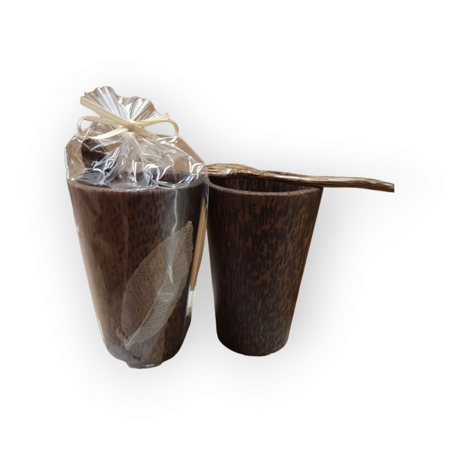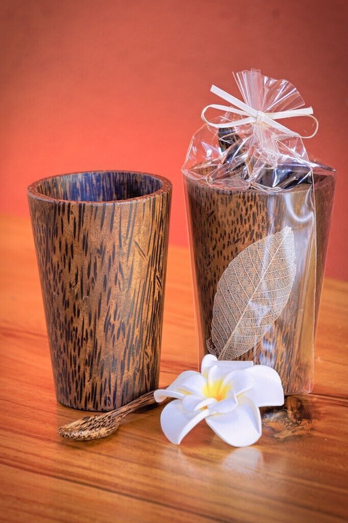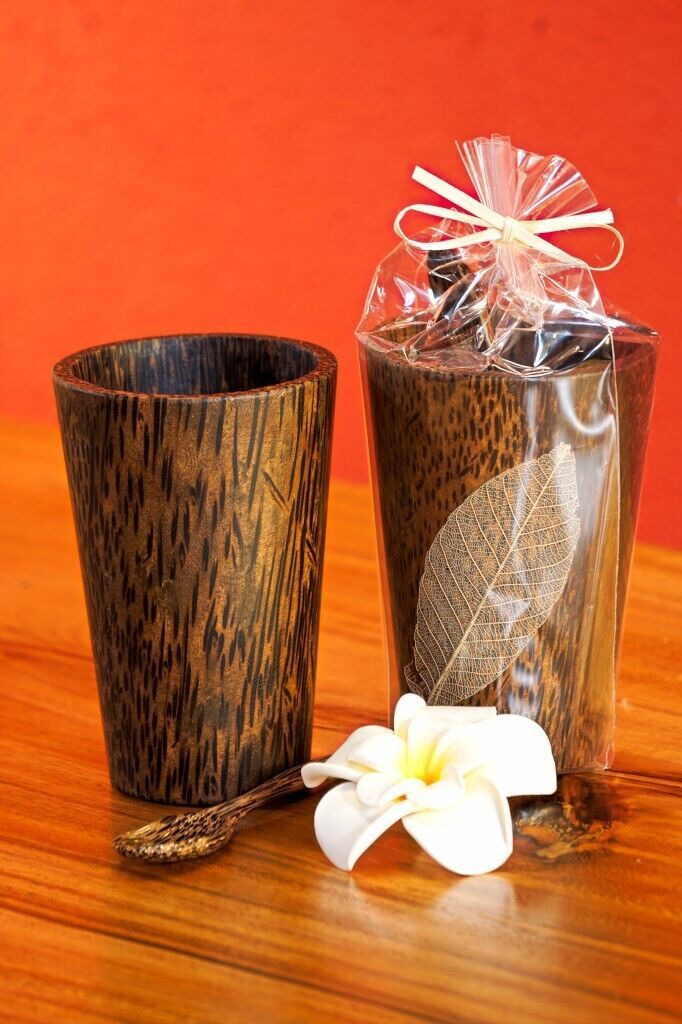 Maße: HxBxT ca 11x7x7cm Material: Palmen Holz Lieferumfang: 1x Palmen Holz Becher mit Löffel Herkunftsland: Thailand Abweichungen vom Artikelbild: Farbe / Maserung: groß Form: keine