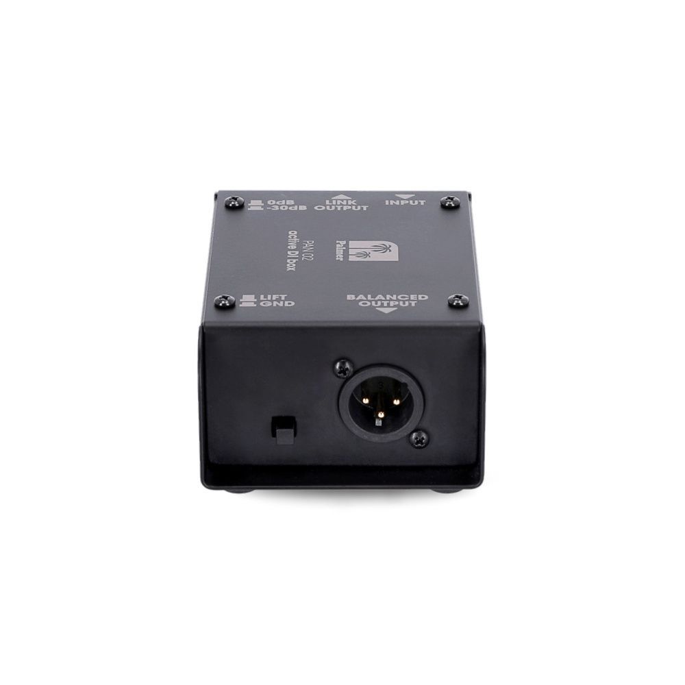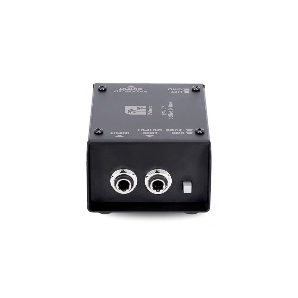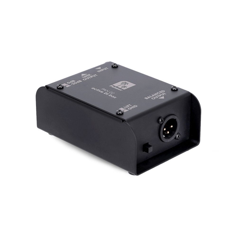 Palmer PAN02 Standard Aktive DI-Box. Kann über 9V Batterie oder 48V Phantomspeisung betrieben werden. Hochohmiger Eingang, größerer Ausgangspegel als eine Passive DI-Box. Die aktive Schaltung ermöglicht die hohe Eingangsimpedanz von 1 MOhm und größere Empfindlichkeit des Einganssignals. (Typische Di