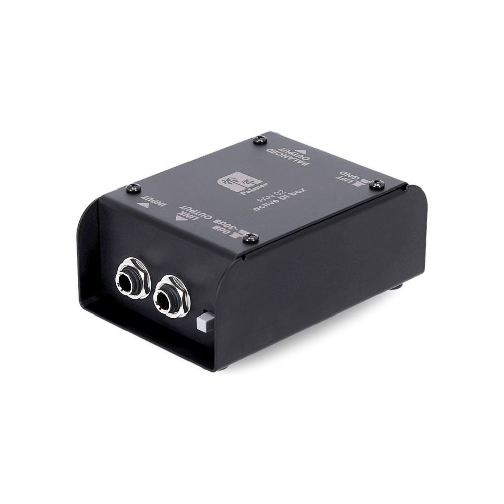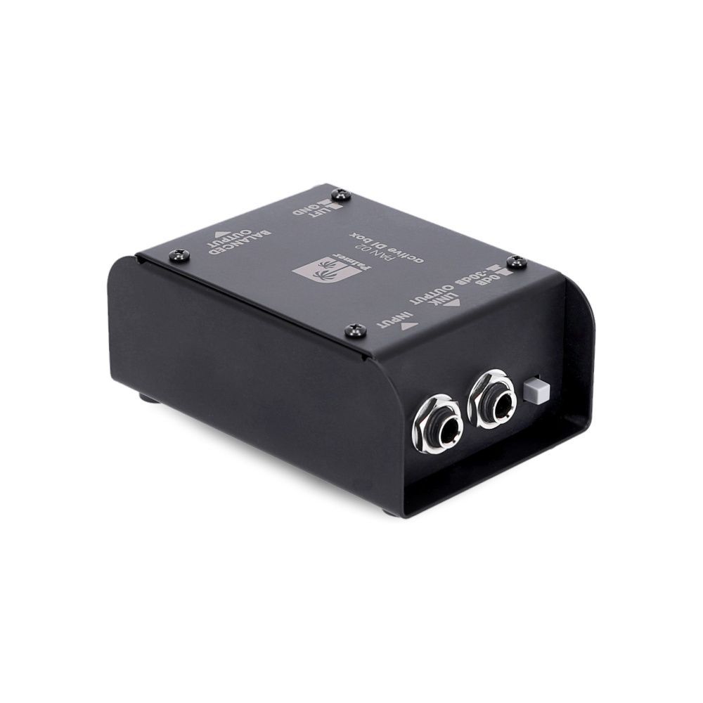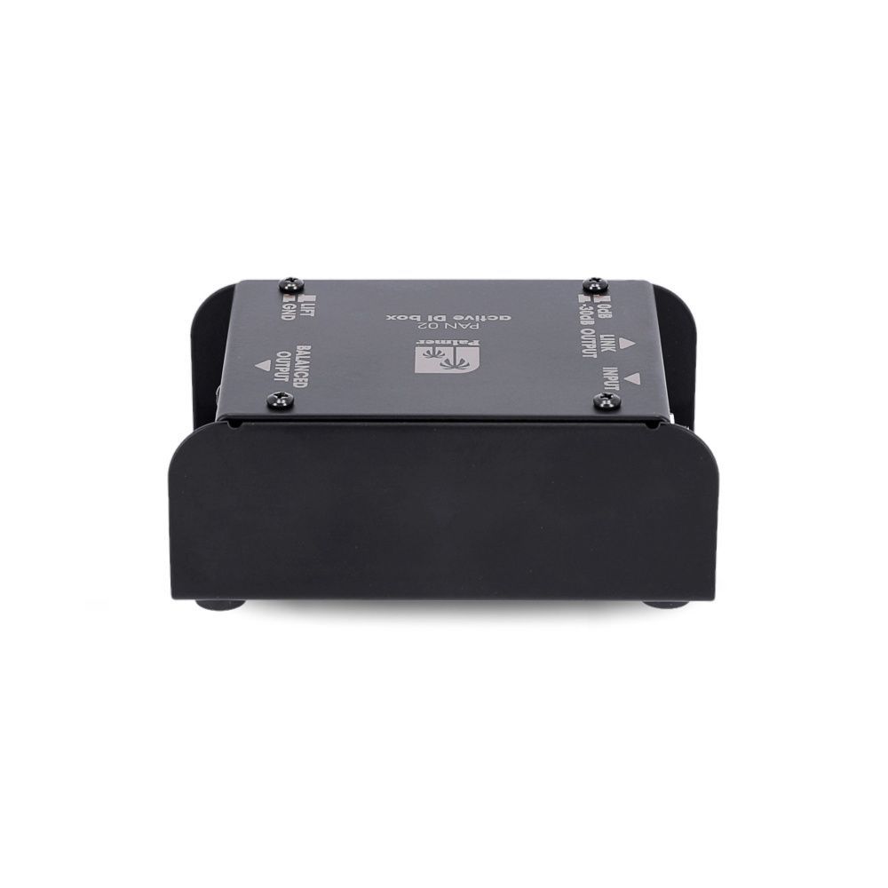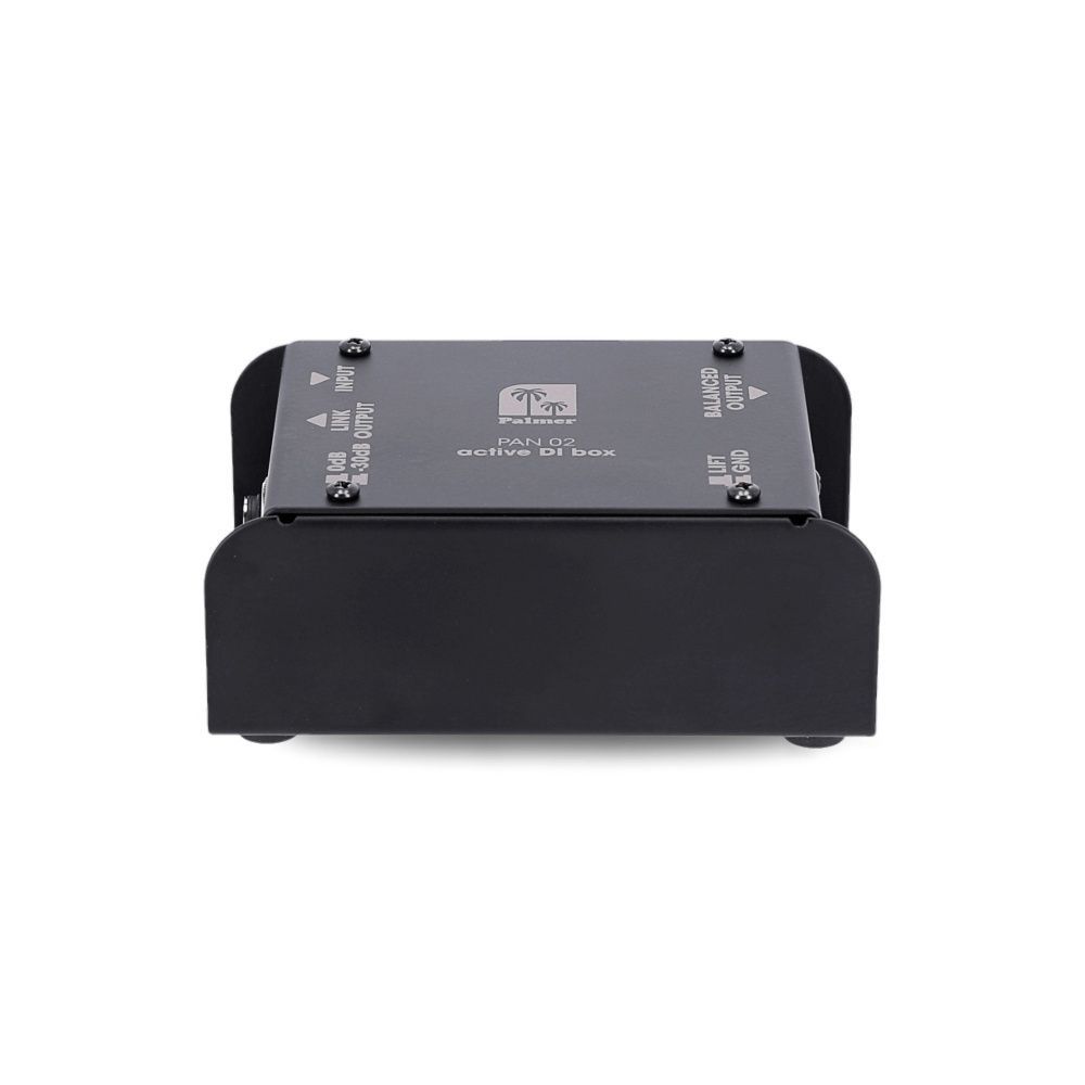 Palmer PAN02 Standard Aktive DI-Box. Kann über 9V Batterie oder 48V Phantomspeisung betrieben werden. Hochohmiger Eingang, größerer Ausgangspegel als eine Passive DI-Box. Die aktive Schaltung ermöglicht die hohe Eingangsimpedanz von 1 MOhm und größere Empfindlichkeit des Einganssignals. (Typische Di