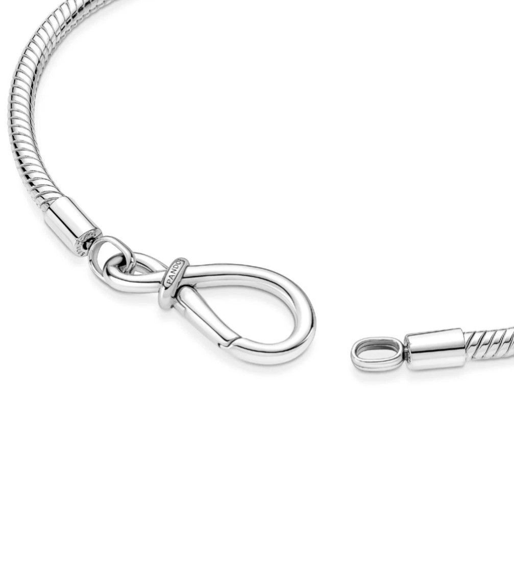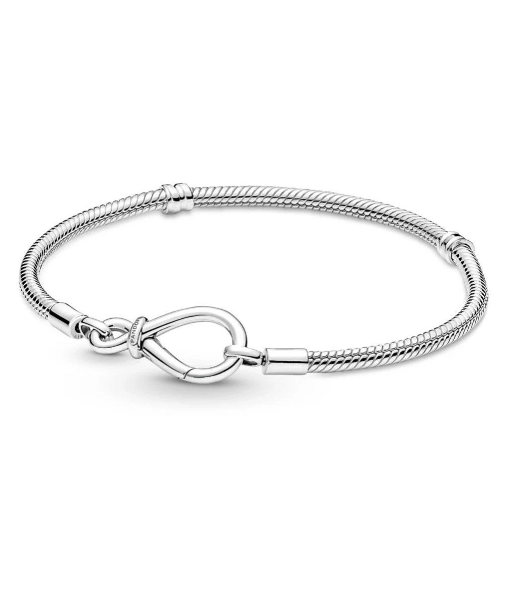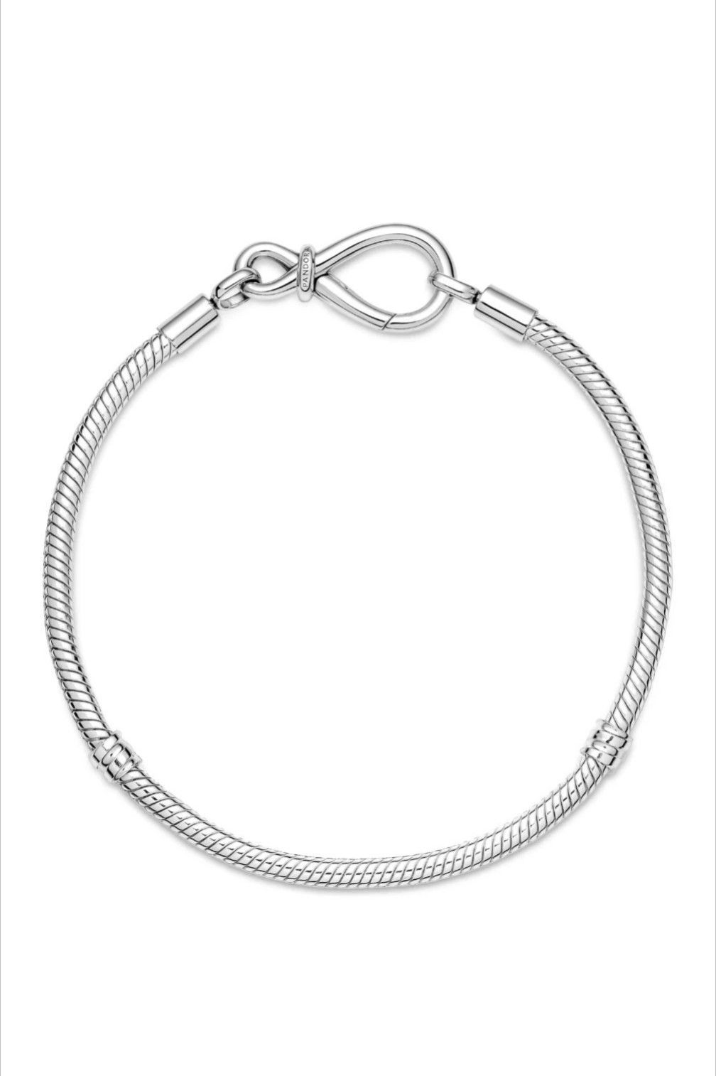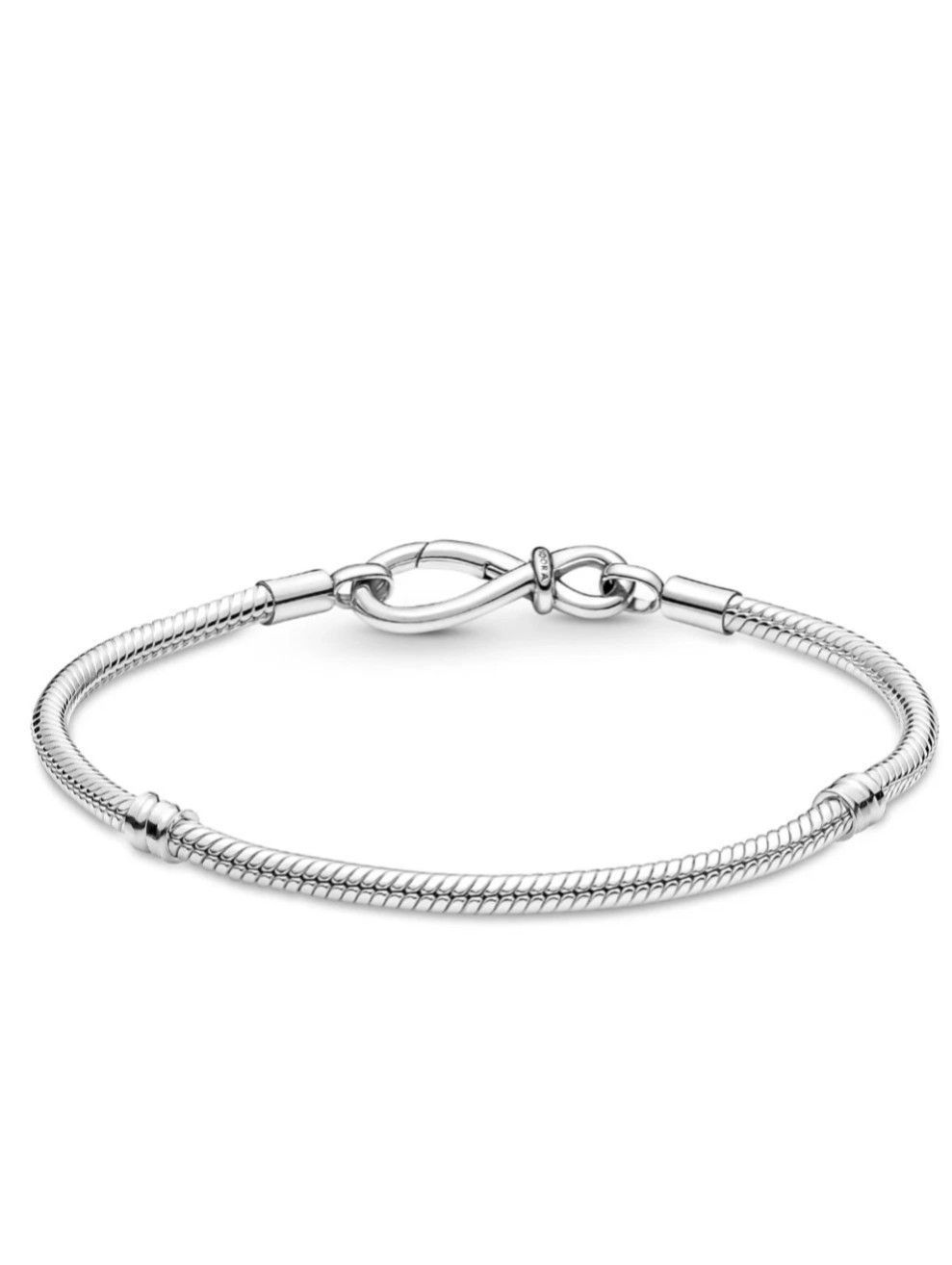 aus der Pandora Moments Kollektion, trendiges Armband für Frauen aus poliertem 925 Sterlingsilber, polierte Schlangenkette, Stärke 3 mm, Karabiner-Verschluss in Form des Unendlichkeitszeichen, patentierte Gewinde unterteilen das Armband in drei Abschnitte, zum Armumfang sollten 2-3 cm dazu addiert w