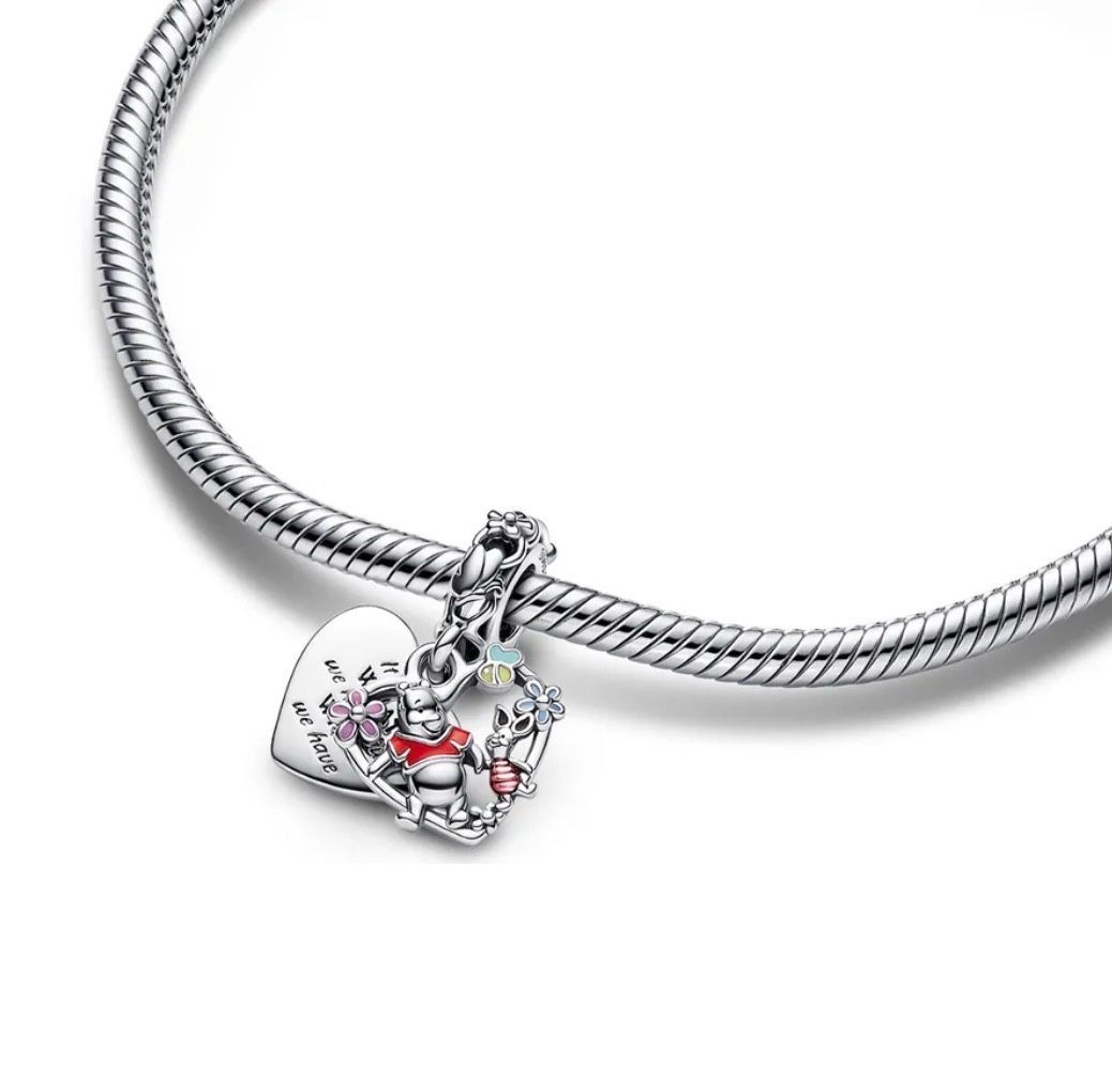 Mit dem Disney x Pandora Charm „Winnie Puuh & Ferkel“ trägst du ein Symbol echter Freundschaft am Handgelenk. Der Anhänger zeigt die beiden beliebten Figuren in detailreicher Gestaltung, umgeben von farbenfrohen Blütenmotiven. Gefertigt aus feinem Sterling Silber und veredelt mit sorgfältig aufgetra