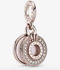 Original Pandora Rose Sparkling Pavé Crown O Dangle Charm (Artikelnummer 789055C01). Der Charm ist handveredelt aus einer einzigartigen Metallmischung, die mit 14 Karat Roségold plattiert ist. Er verfügt über zwei Anhänger: eine Scheibe mit funkelnden klaren Zirkonia-Steinen und eine Rückscheibe mit weicher rosa Emaille. Das Design zeigt das ikonische Pandora Crown O, umgeben vom Pandora-Logo.
