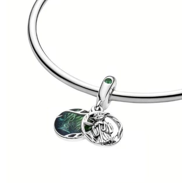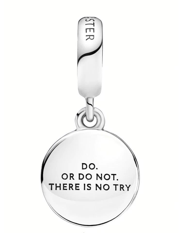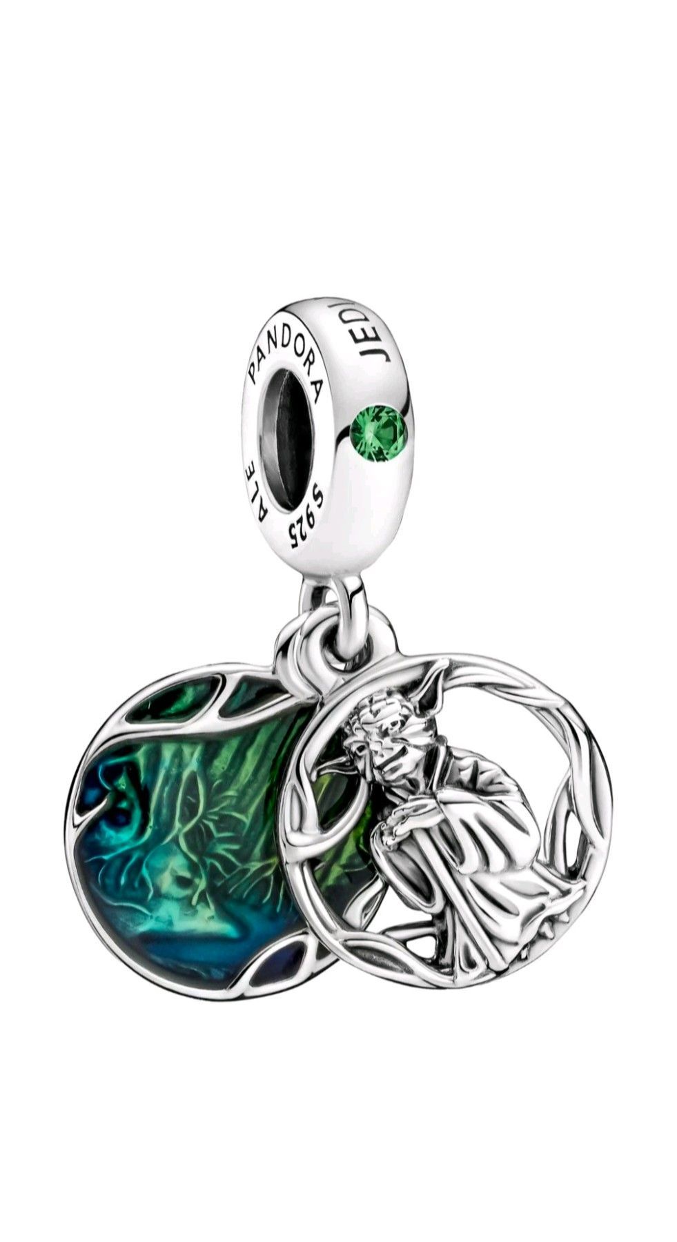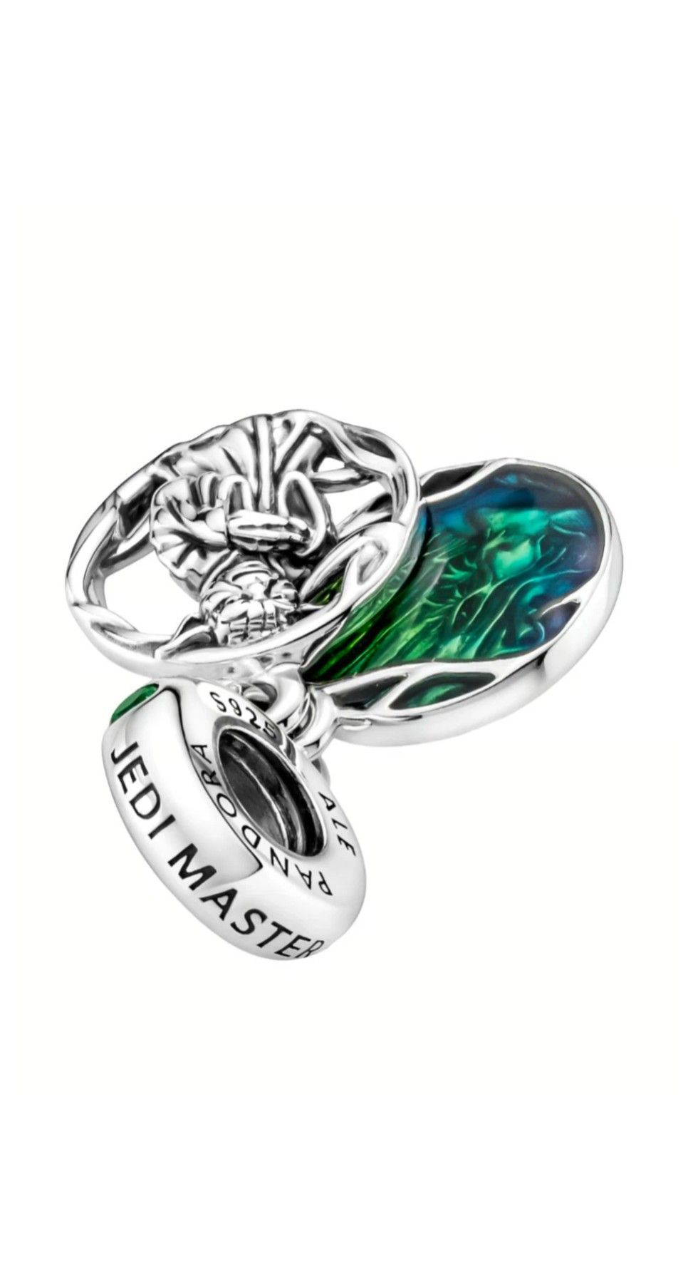 Pandora x Star Wars "Yoda" Charm Anhänger, aus Sterling-Silber handveredelt und besteht aus zwei Anhängern. von Hand aufgetragener grüner und blauer Emaille mit Gravur „Do. Or do not. There is no try“ und der Aufhänger ist mit „Jedi Master“ graviert.