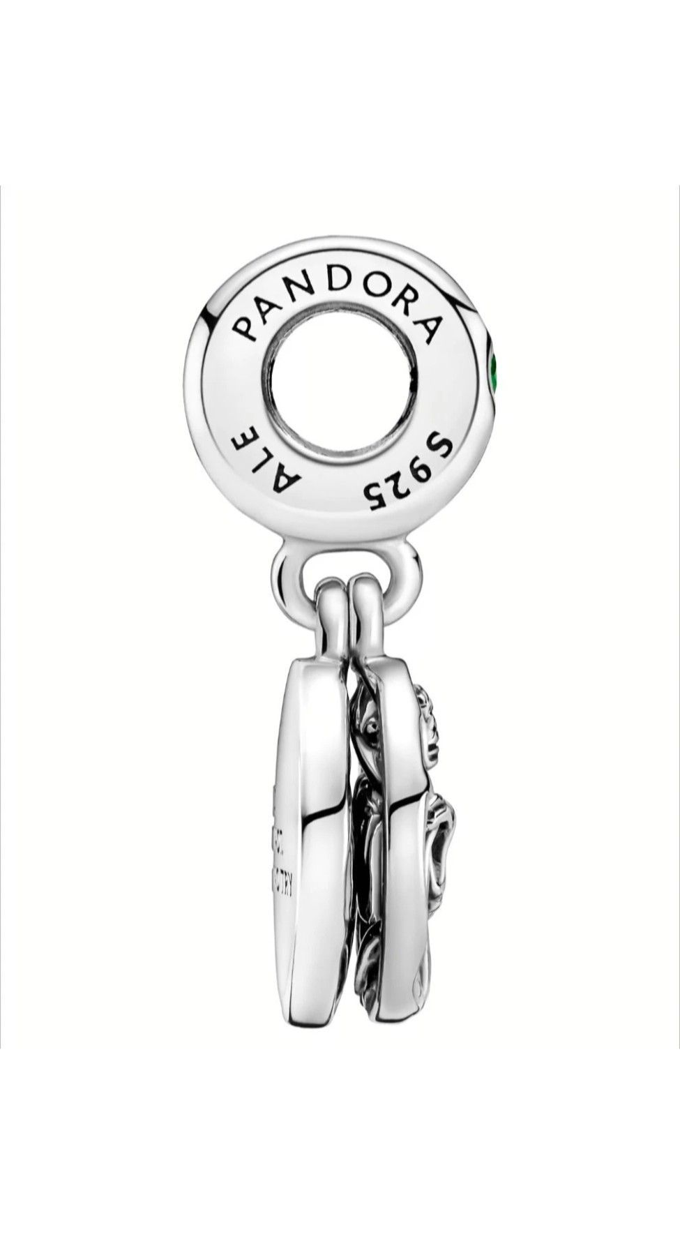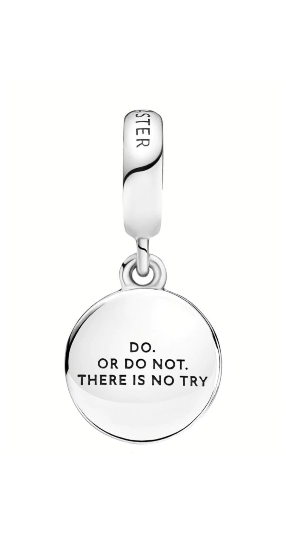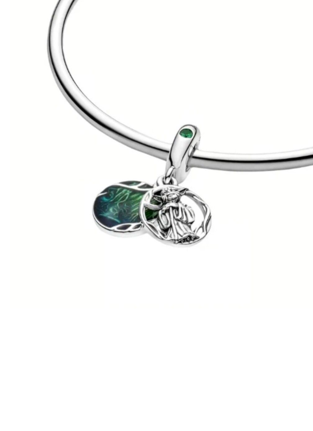 Pandora x Star Wars "Yoda" Charm Anhänger, aus Sterling-Silber handveredelt und besteht aus zwei Anhängern. von Hand aufgetragener grüner und blauer Emaille mit Gravur „Do. Or do not. There is no try“ und der Aufhänger ist mit „Jedi Master“ graviert.