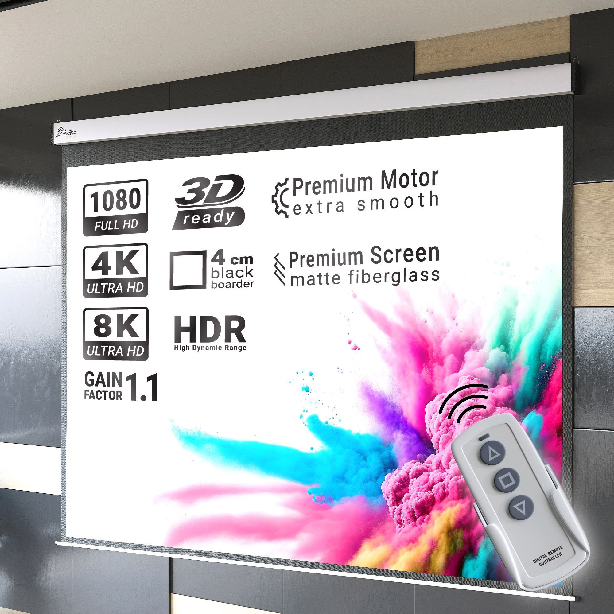 Pantera | Motorleinwand | 240 x 240 cm | 134" | 1:1 | Premium Rohrmotor | 4K/8K Ultr