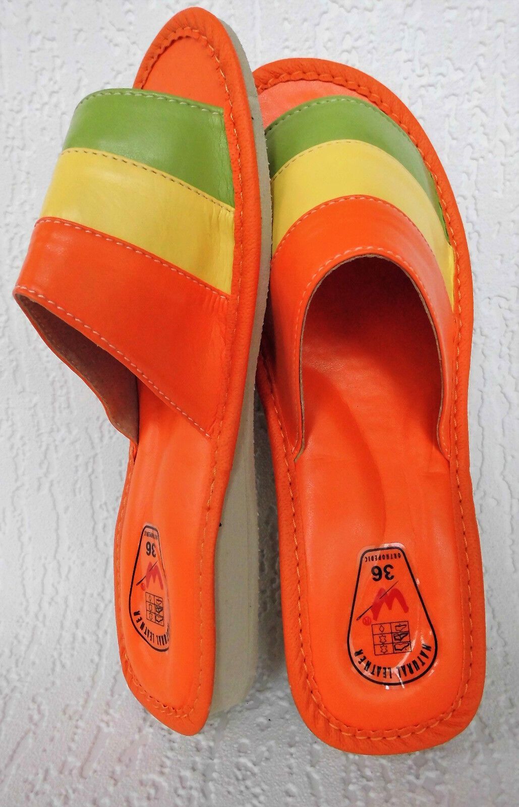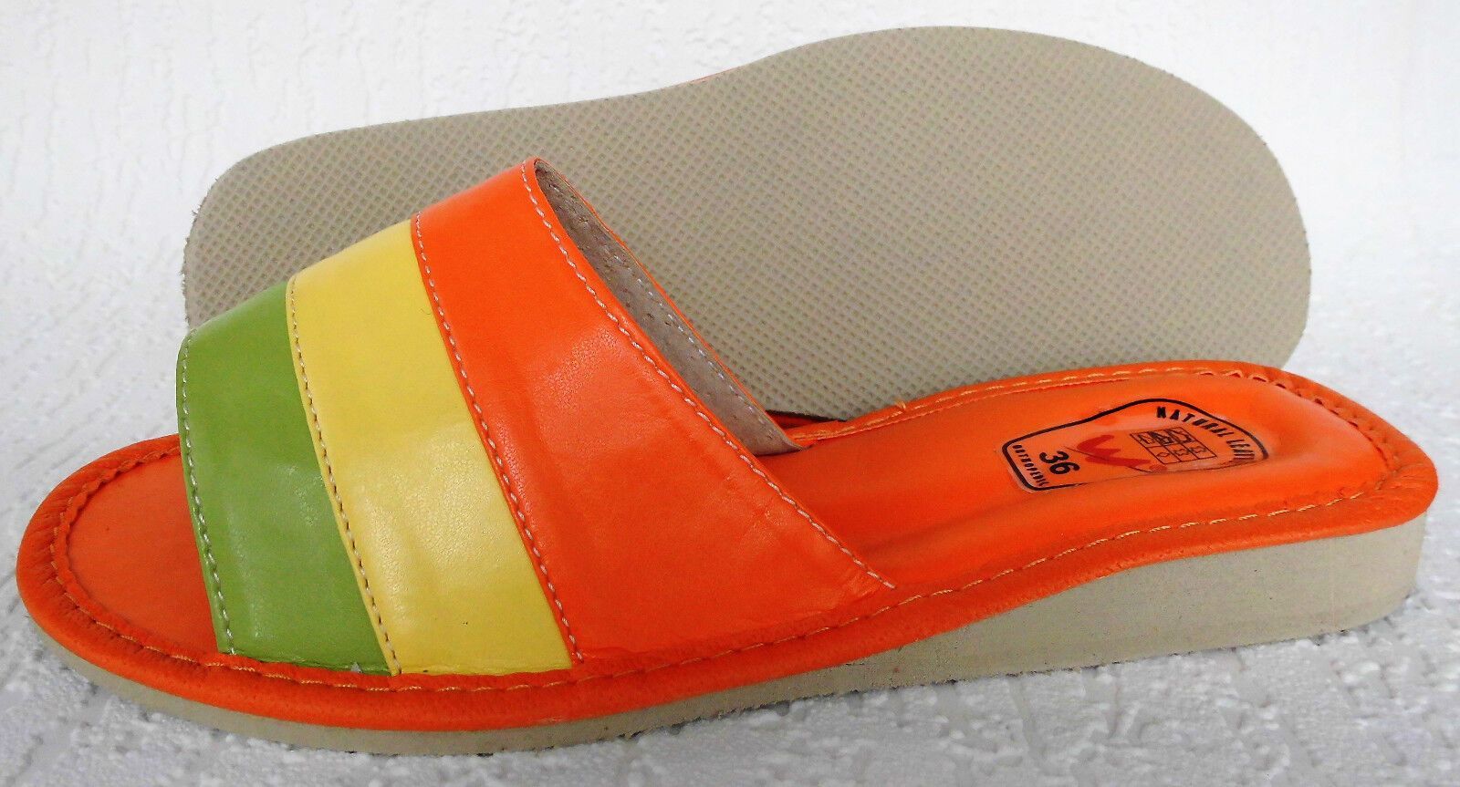 ****Sehr schöne und bequeme Hausschuhe - Latschen - Pantolette Gr.36 Kunstleder ****Obermaterial aus hochwertigem, weichem Kunstleder (ECO LEDER) ****Die Sohle besteht aus Gummi (rutschfest) **** Farbe - ORANGE - GRÜN - GELB ****Neu, keine billig Ware, sehr stabile Ausführung ****Hergestellt in PL S
