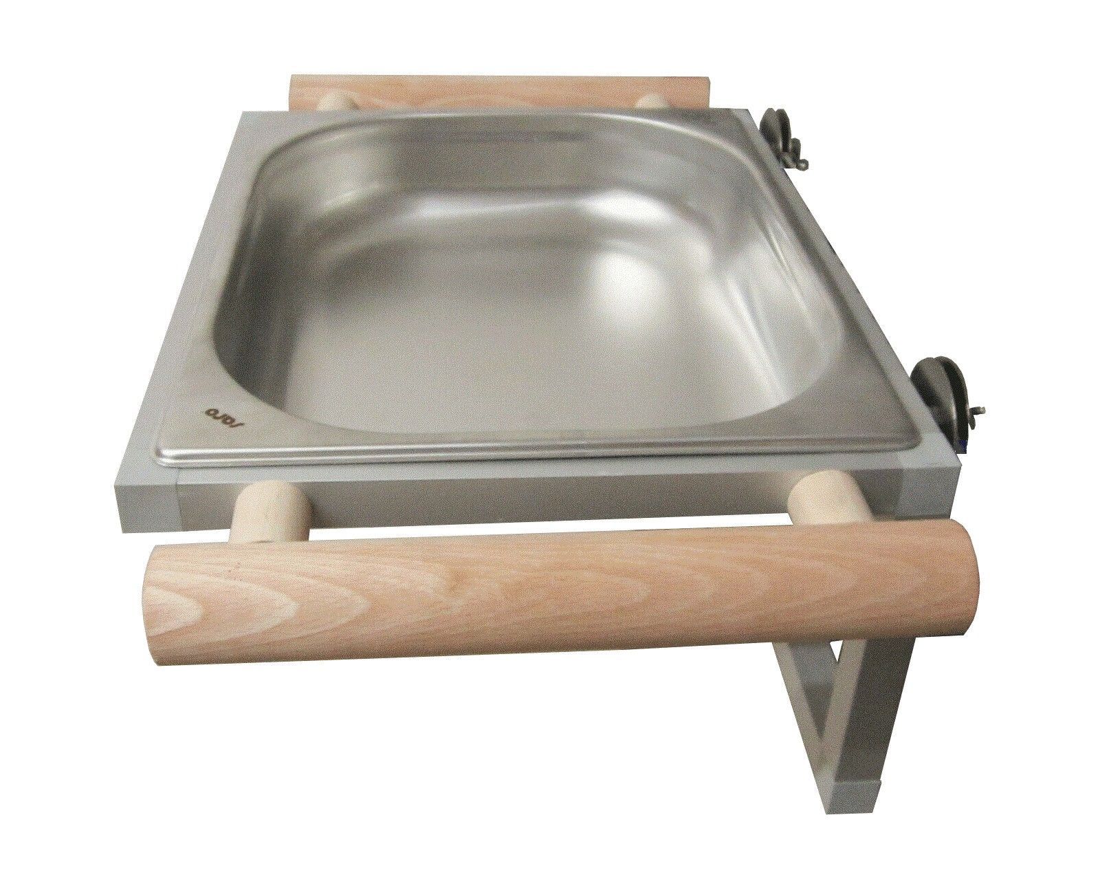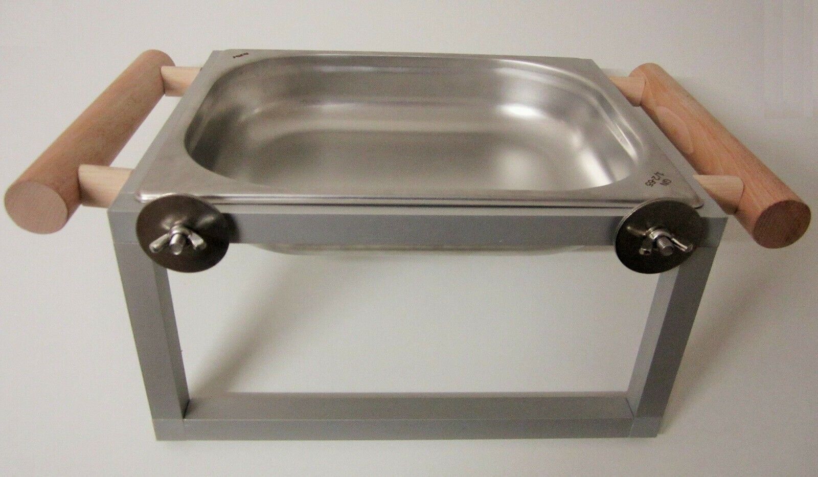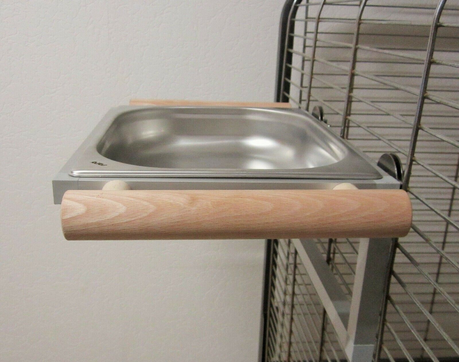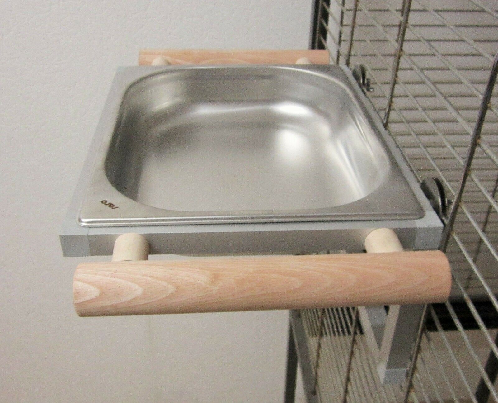 Qualitäts-Badewanne aus Edelstahl in 2 Beckengrößen so wie jeweils 3 Sitzaststärken. Zum Anschrauben an Käfiggitter Badewanne abnehmbar. Im Alugestell mit Winkelrahmen für höchste Stabilität.
