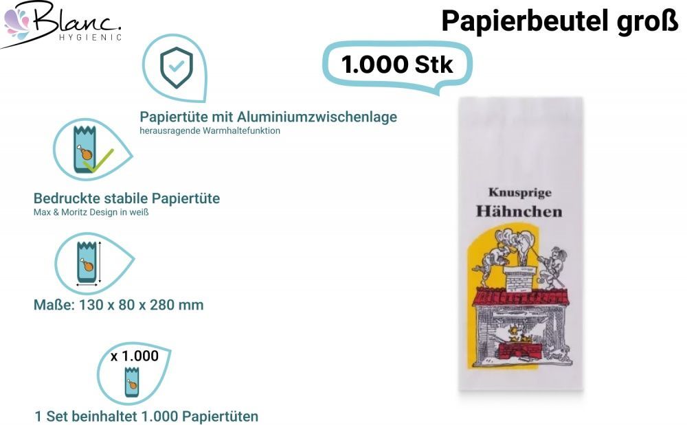 Papierbeutel mit Aluminium Zwischenlage groß, 1000 Stück, 130x80x280mm, Hähnchenbeute