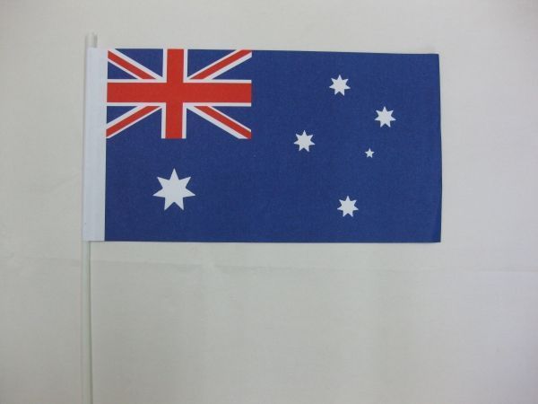 Papierfähnchen "Australien" - ca. 12 x 24 cm inkl. Kleberand an weißem ca. 40 cm Polystyrolstab Duchmesser: 4 mm geklebt