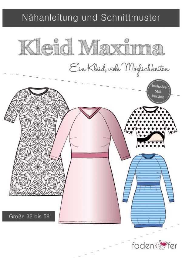 Ein Kleid viele Möglichkeiten - Kleid Maxima Der Schnitt Maxima behinhaltet 4 verschieden Nähvarianten und 2 verschiedenen Halsausschnitten. (Rundhals und V-Ausschnitt) Im Schnitt enthalten sind die Größen 32 bis 58 . Maxima kann man mit kurzen, 3 4 – und langen Ärmeln nähen, außerdem ist ein