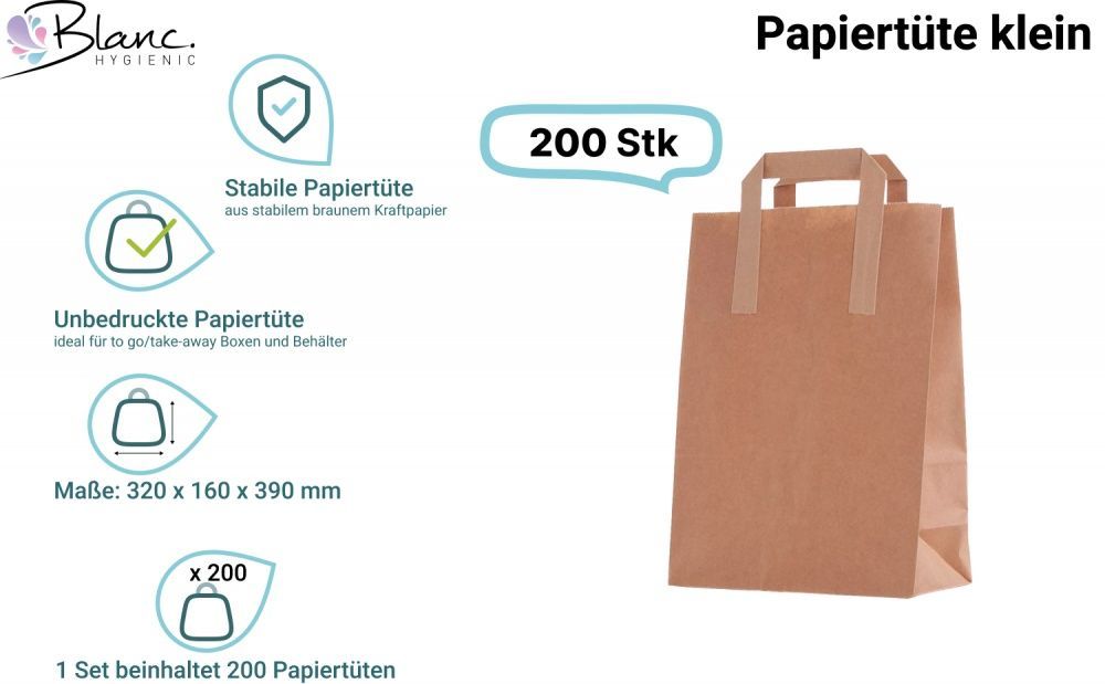 Papiertüten klein, 200 Stück Papiertaschen, Papiertragetaschen braun, 32 x16 x 39 cm,
