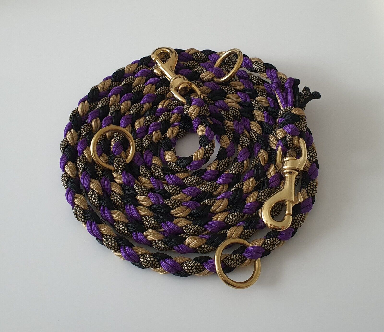 Eine wunderschöne Hundeleine, die jedes Gassigehen zu einem Event macht. Mit der personalisierbaren Paracord-Leine in den Farben Dunkelviolett, Gold, Schwarz und Schwarz Gold-Diamond hältst du ein Accessoire in deinen Händen, das deine Fellnase zum Strahlen bringen wird. Die Metallteile glänzen in d