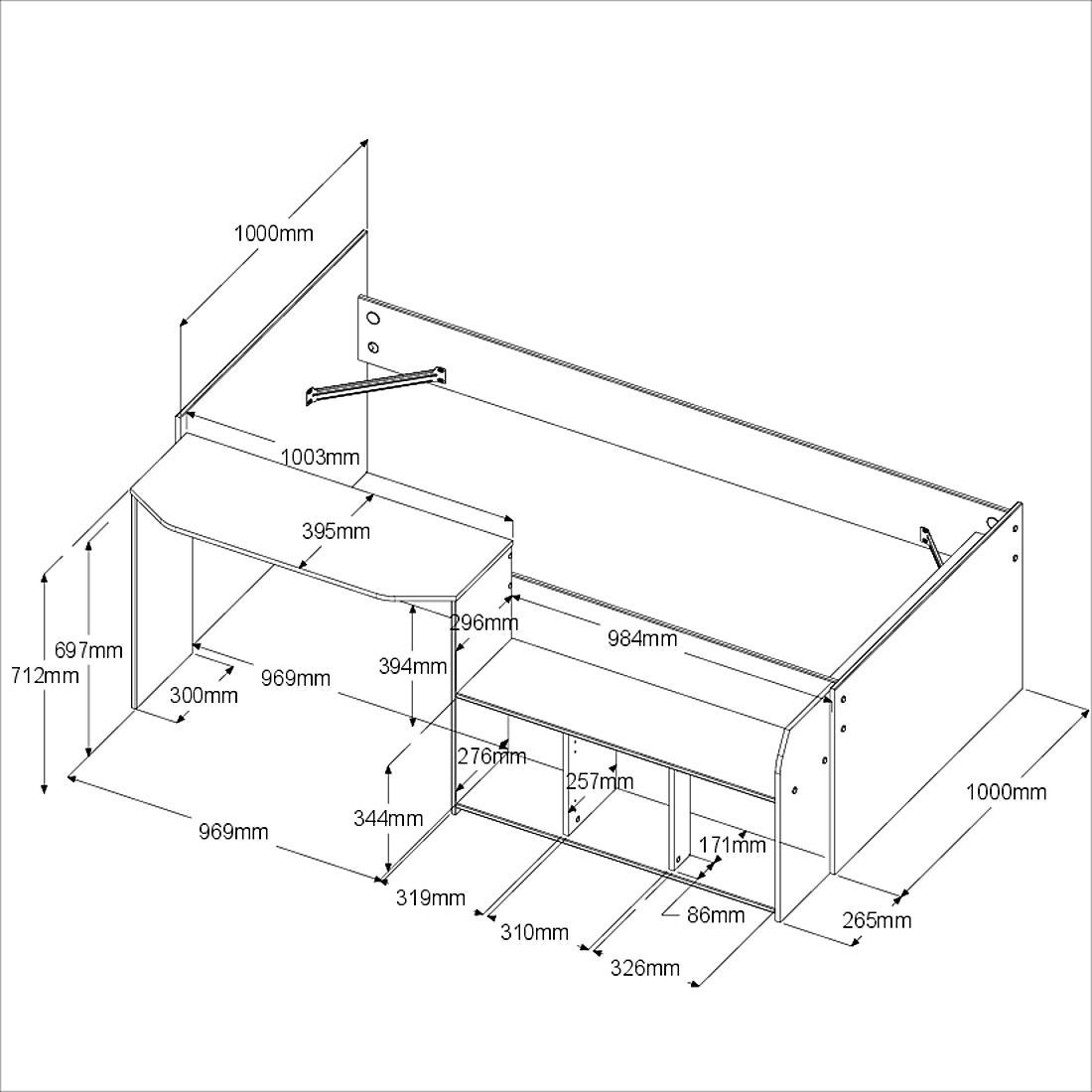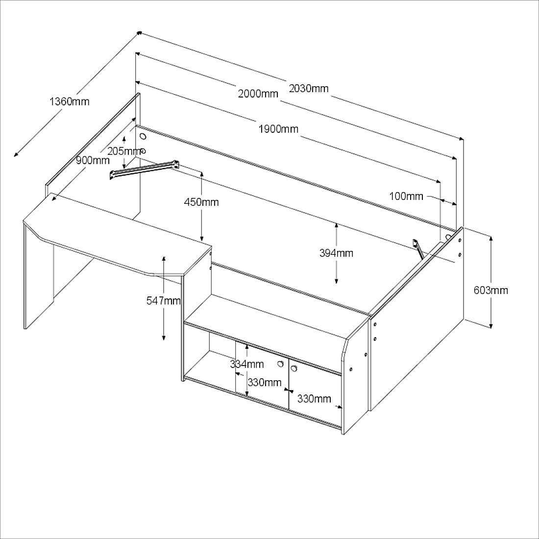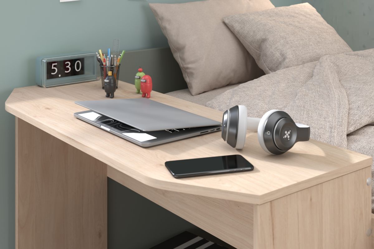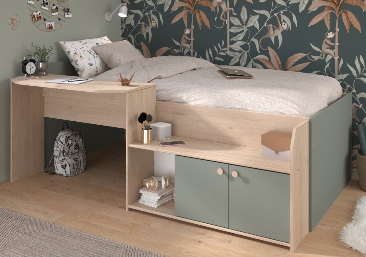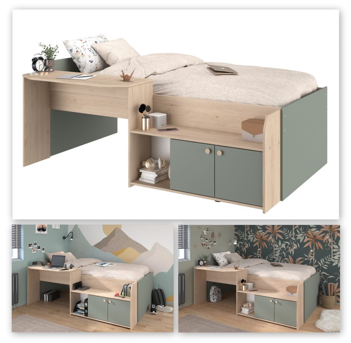 Parisot Hochbett "Madre" Eiche Dekor und grün Stauraumbett 90 x 200 mit Schreibtisch