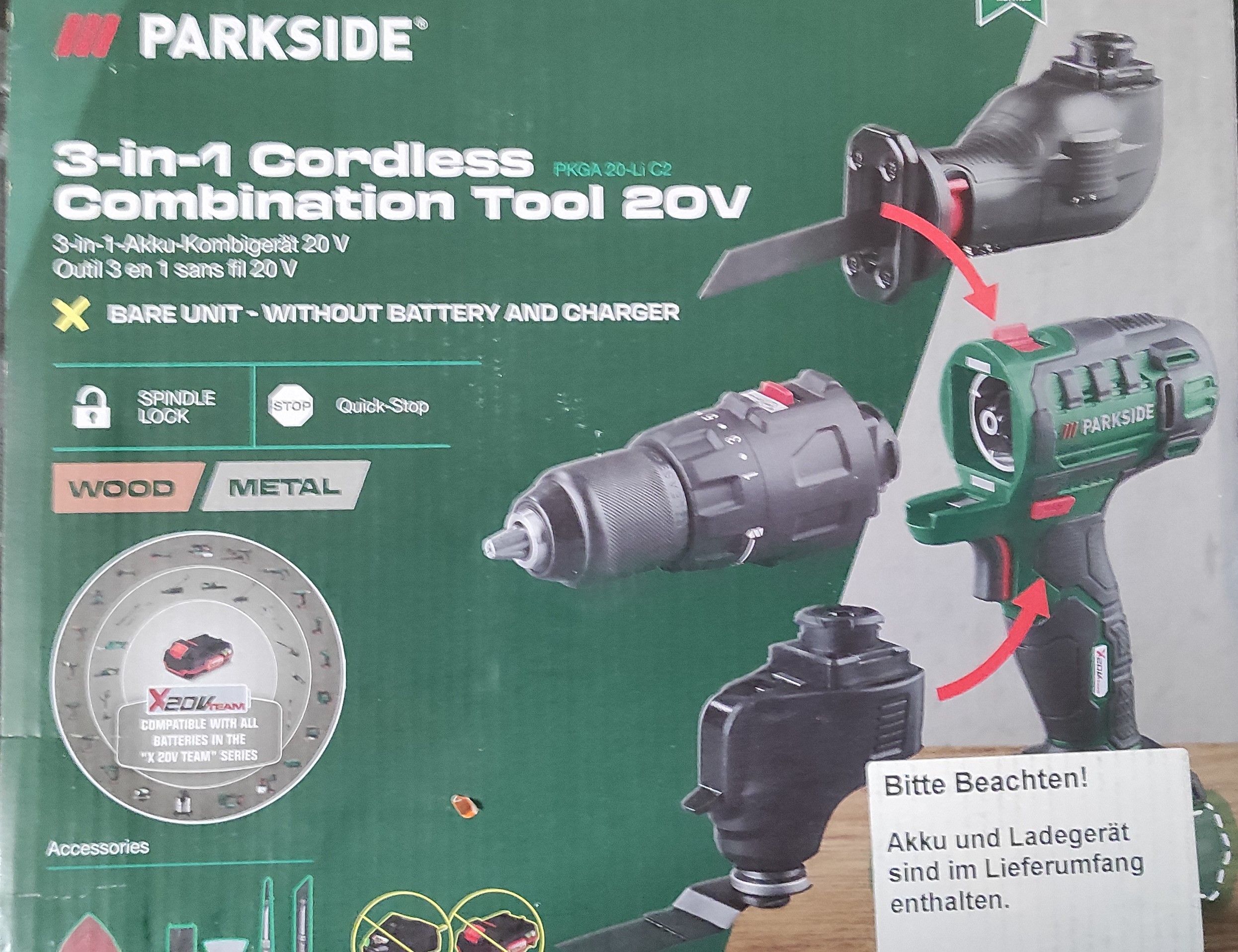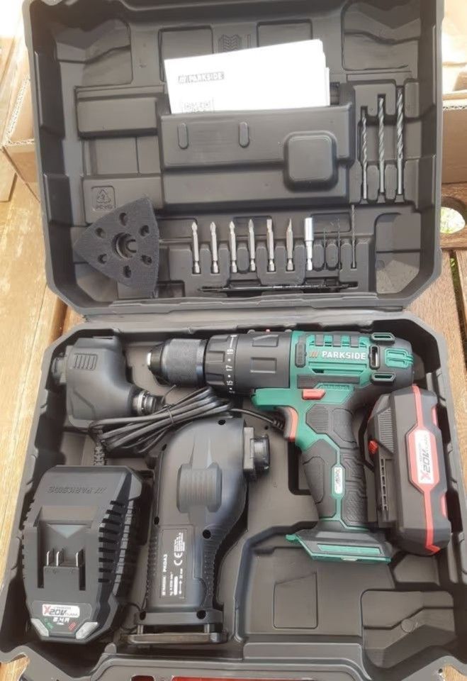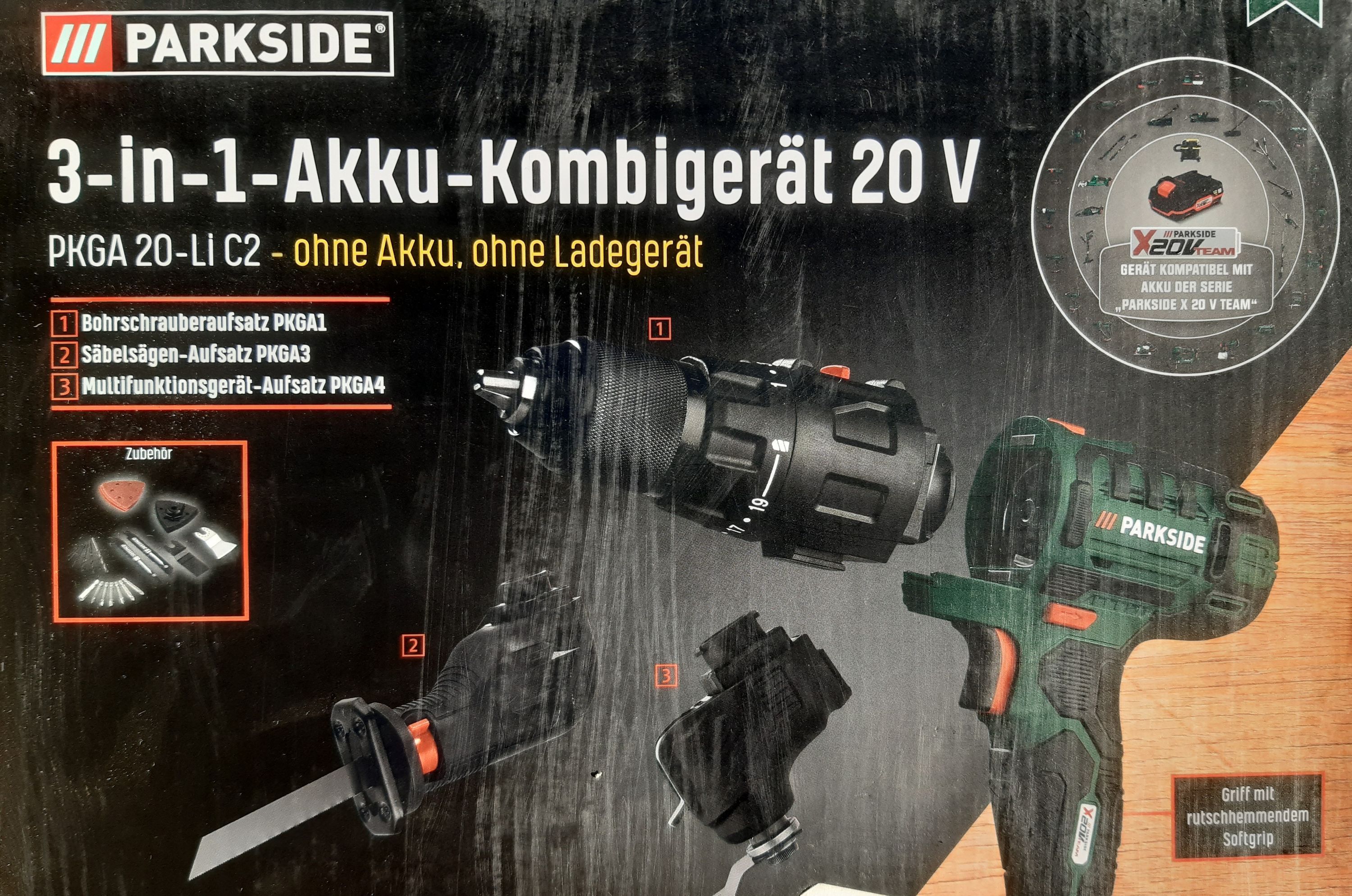 Aussteller wie neu , originalverpackt Verpackung kann geöffnet sein Parkside Akku-Kombigerät 20 V PKGA 20-Li C2 mit Akku PAP 20 B1 und mit Ladegerät PLG 20 C1 im Koffer 3 in 1: Bohrschrauber, Säbelsäge und Multifunktionsgerät Schneller, werkzeugloser Aufsatzwechsel Stufenlose Drehzahlsteuerung inkl.... Mehr
