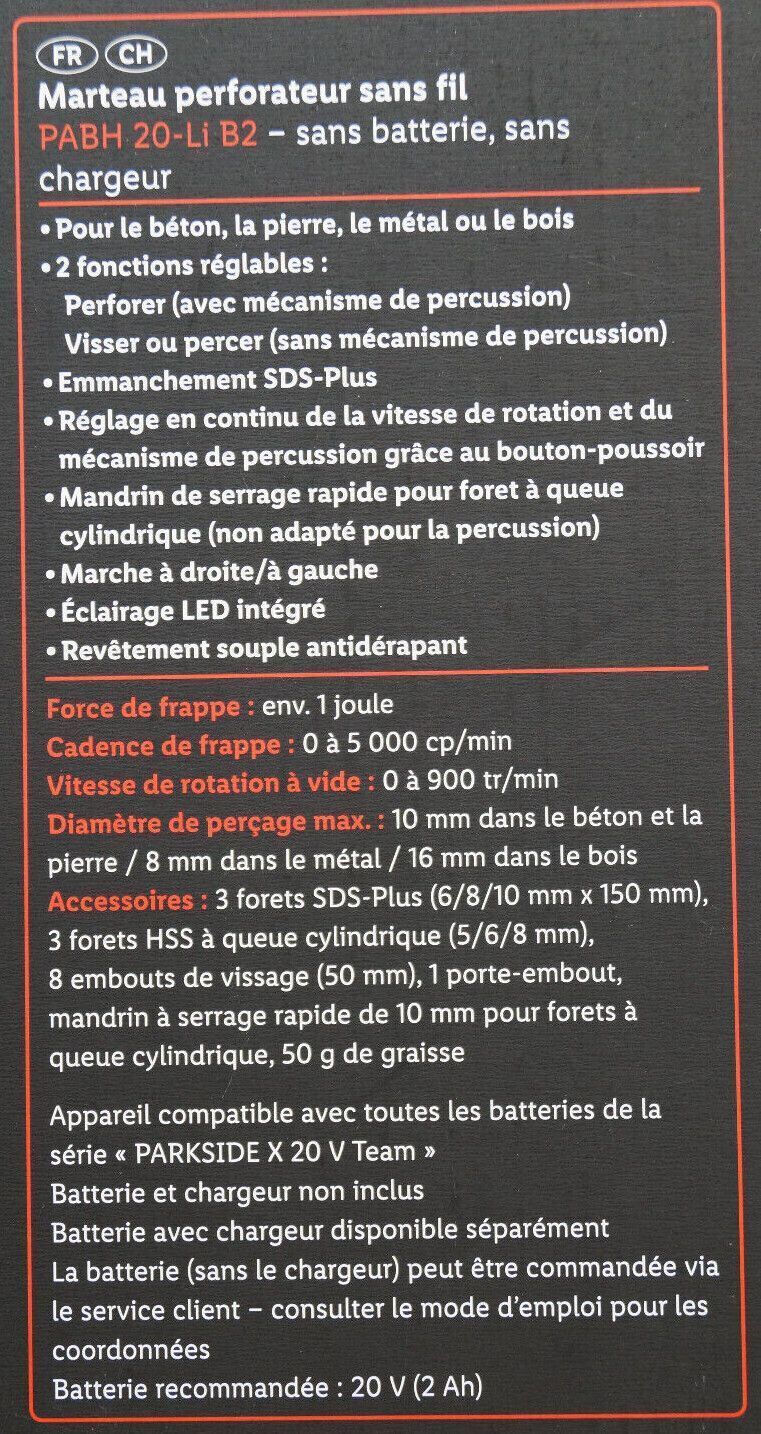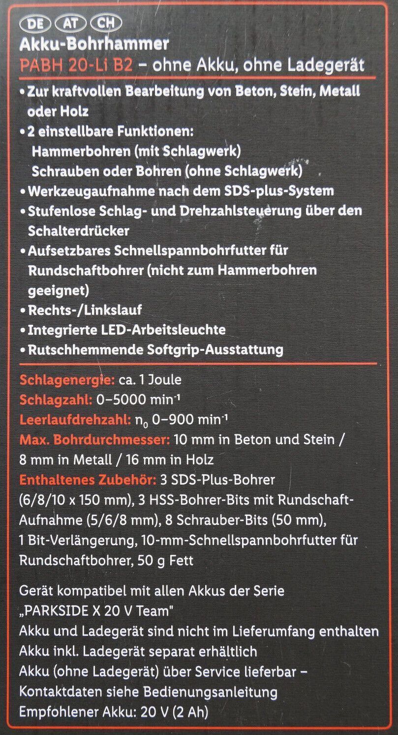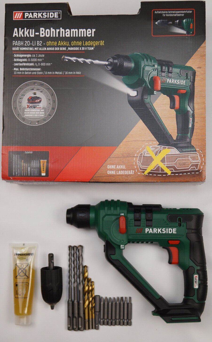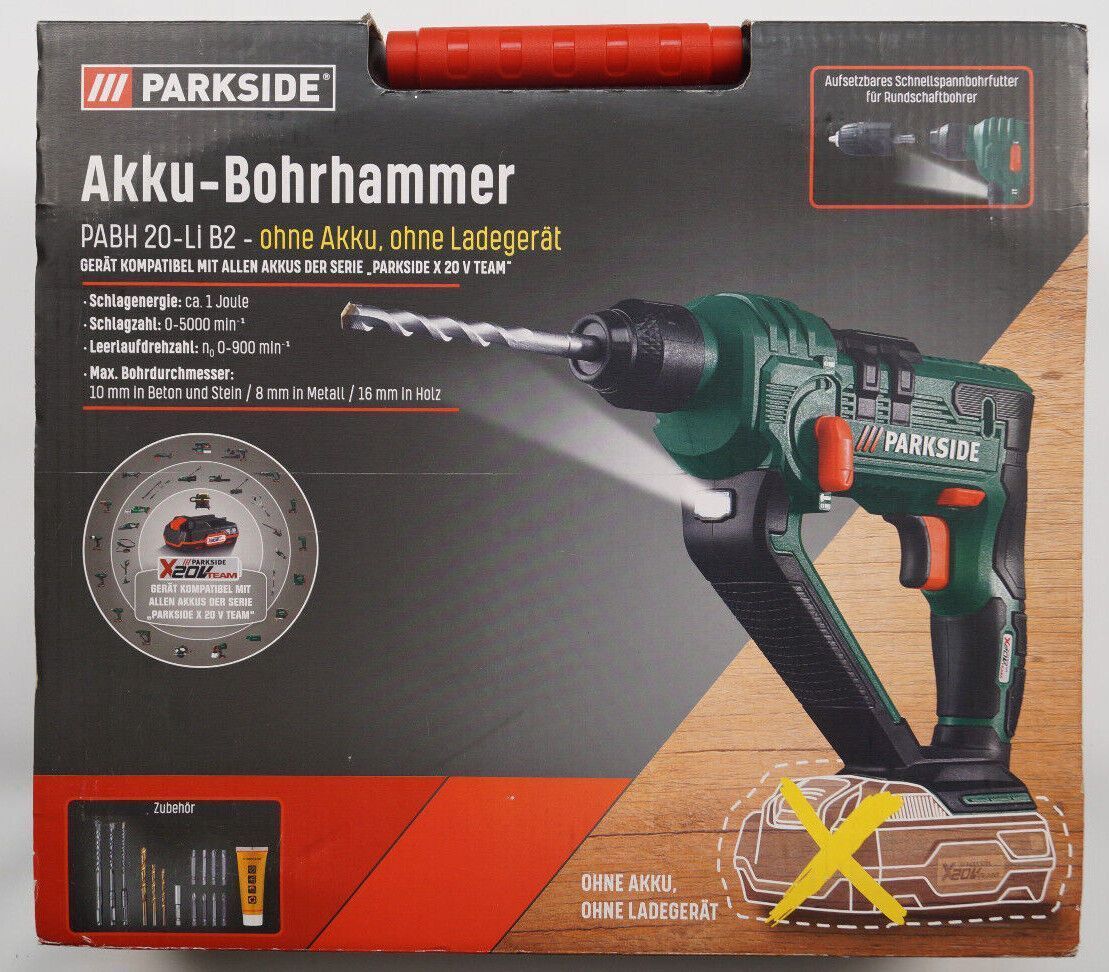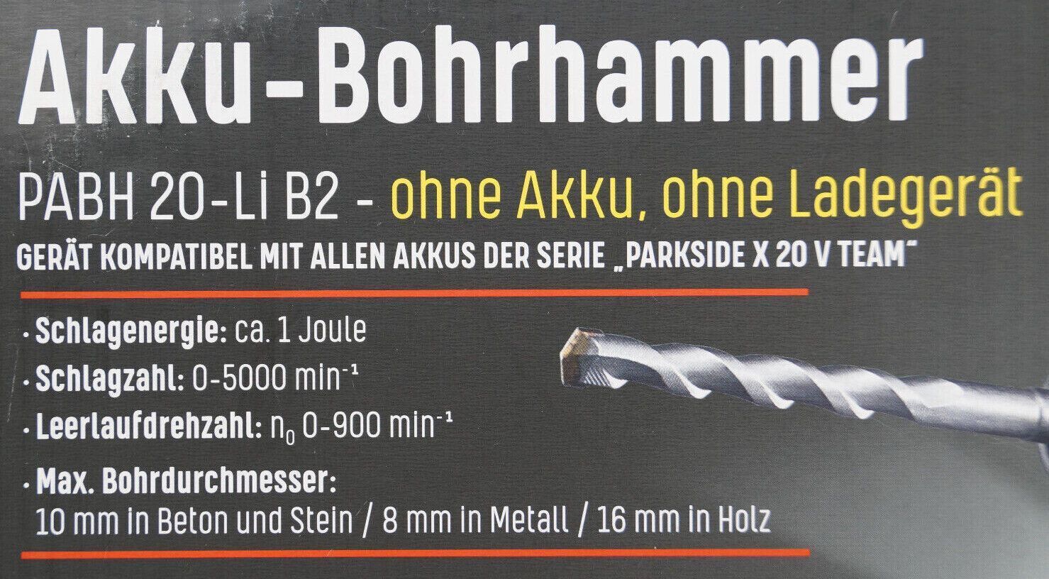 Hier können Sie einen Akku-Bohrhammer von Parkside erwerben. +++inkl. Koffer+++ Zustand: NEU, unbenutzt und in der Originalverpackung Marke: Parkside Modell: PABH 20-Li B2 Eigenschaften Zur kraftvollen Bearbeitung von Ziegel, Metall oder Holz 2 einstellbare Funktionen: Hammerbohren (mit Schlagwerk)